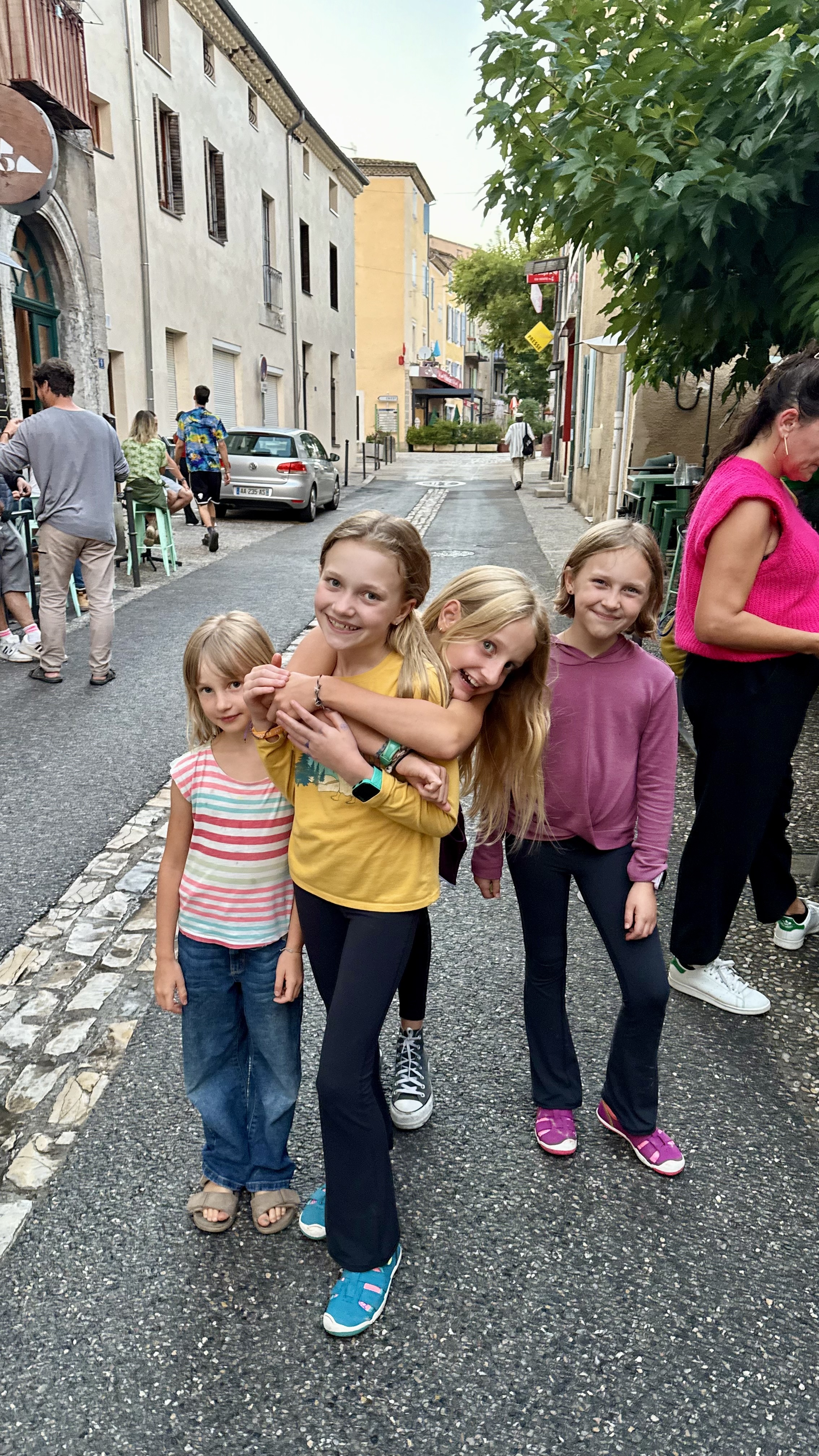 The next day was off to slow start, when we all awoke at 11. But we rallied so that Elsa and Noemi and their cousin Leanne could come to our house to play for the afternoon. With five girls together, the language gap showed itself. Finlee does not speak French and sometimes feels outside the circle. Arya helps, but it is easy for Finlee to be left out. There were some frustrating moments, but mostly the girls spoke the Language of Play as they roamed around the narrow cobblestone streets of Saillans, chasing cats, knocking on random doors, and whatever else kids do in small villages.