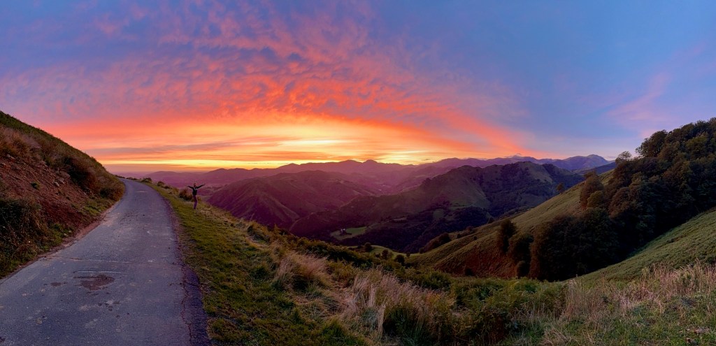 The next morning we rose early and were rewarded with a stunning sunrise. Then we set out across the Pyrenees toward Roncesvalles. What began as a steady climb quickly turned into a battle with the wind. Once above the tree line, gusts whipped around us so fiercely that we pulled jackets tight and pressed into the slope just to keep moving forward. We wouldn’t say the girls never complained, but they certainly dug deep and carried on with the kind of grit that made us burst with pride. The silver lining of the wind was a lack of fog that oft obscures the incredible vistas—mountains covered in a fuzzy coat of green grass and dotted with grey rocks and white herds of sheep. The legendary Pyrenees did not disappoint.