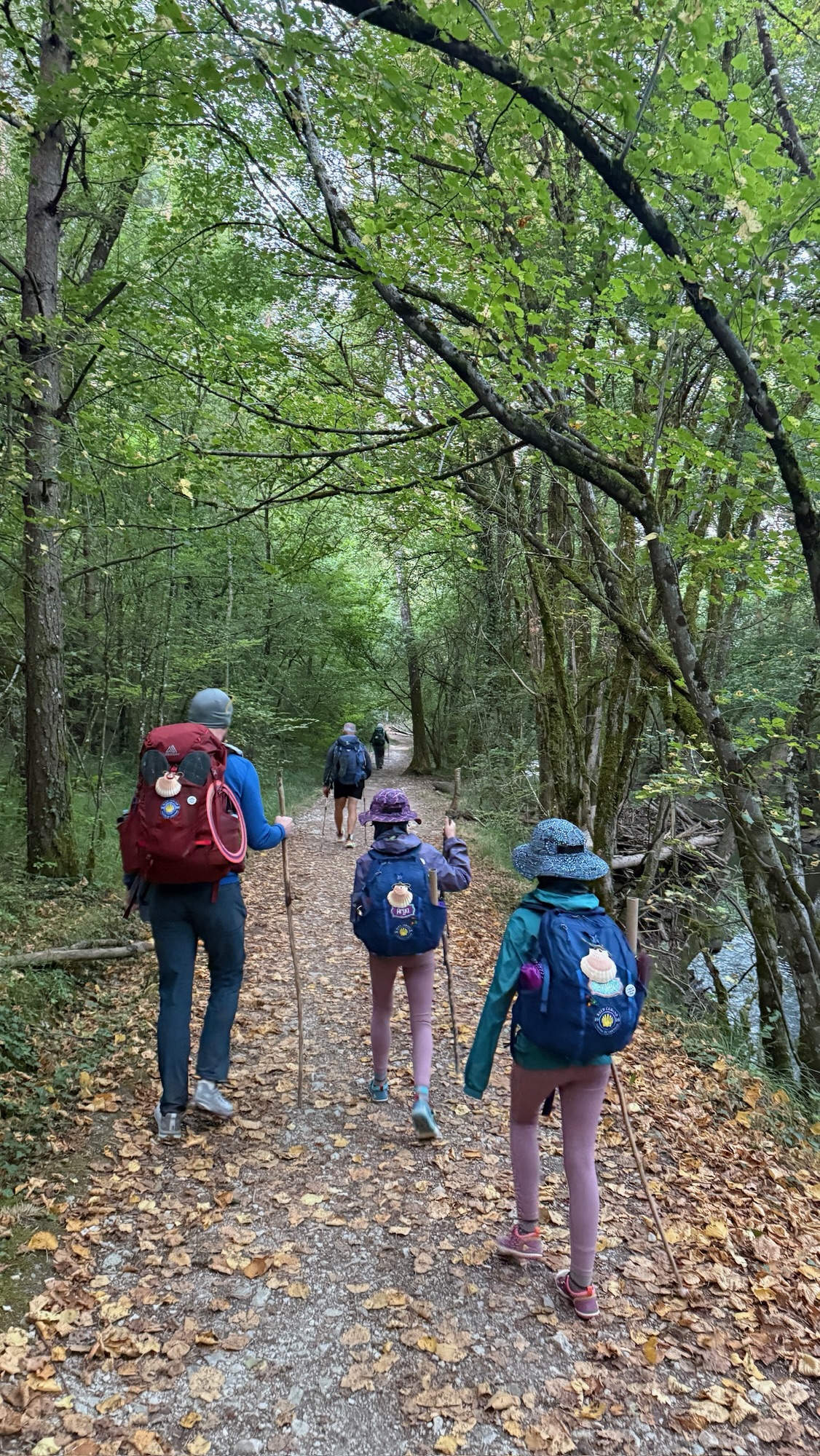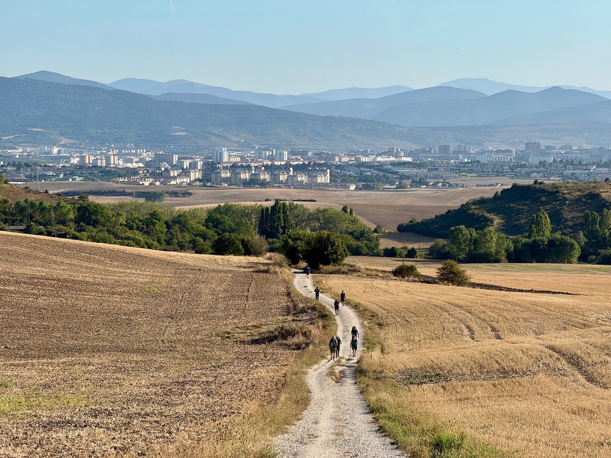 September 6 brought us 16.3 km from Larrasoaña to Pamplona. About 3 km in, we stopped at a riverside café for a classic breakfast of fried eggs, Basque chorizo, tortilla Española, coffee, and hot chocolate. Sharing the table with Ben, Hilda, and June made it even better. Australians, it turns out, are everywhere on the Camino.
