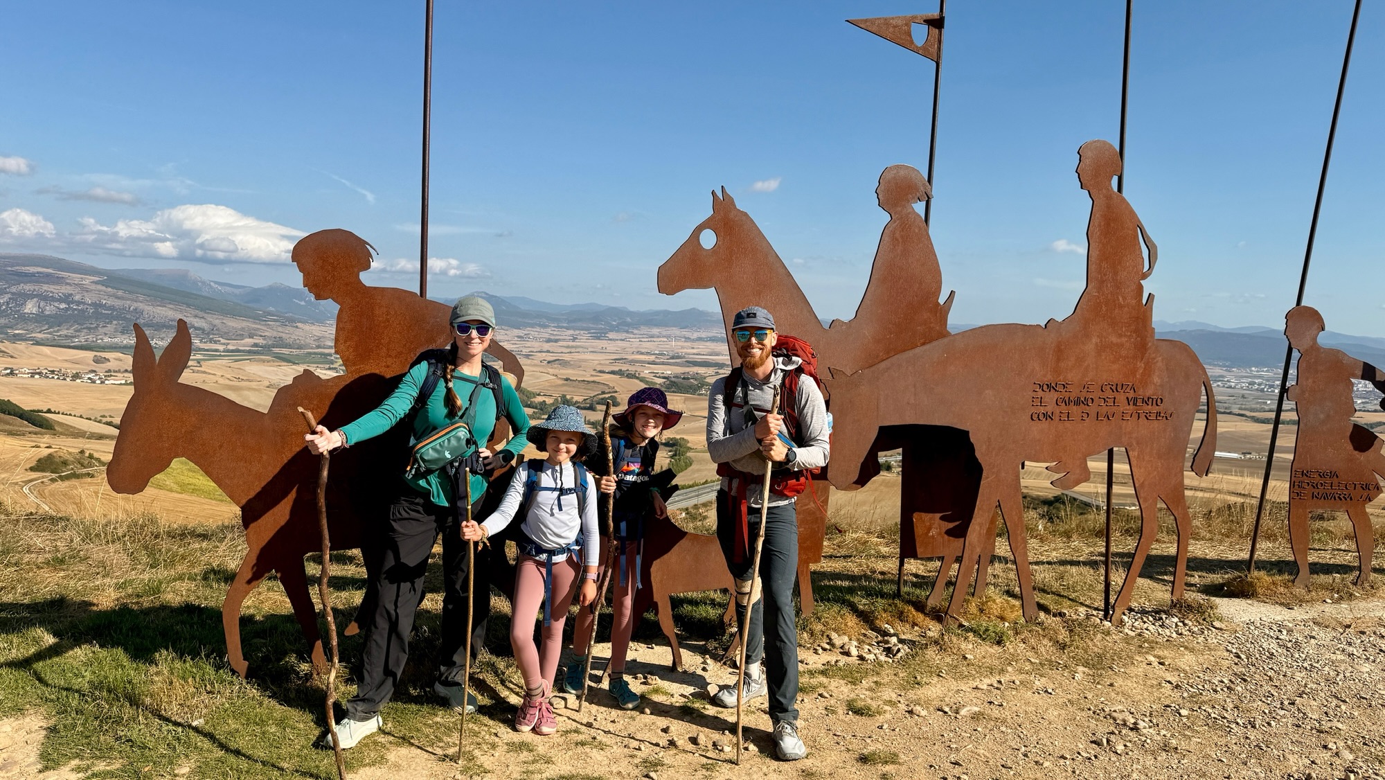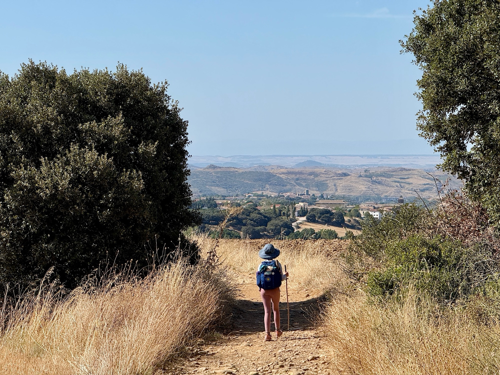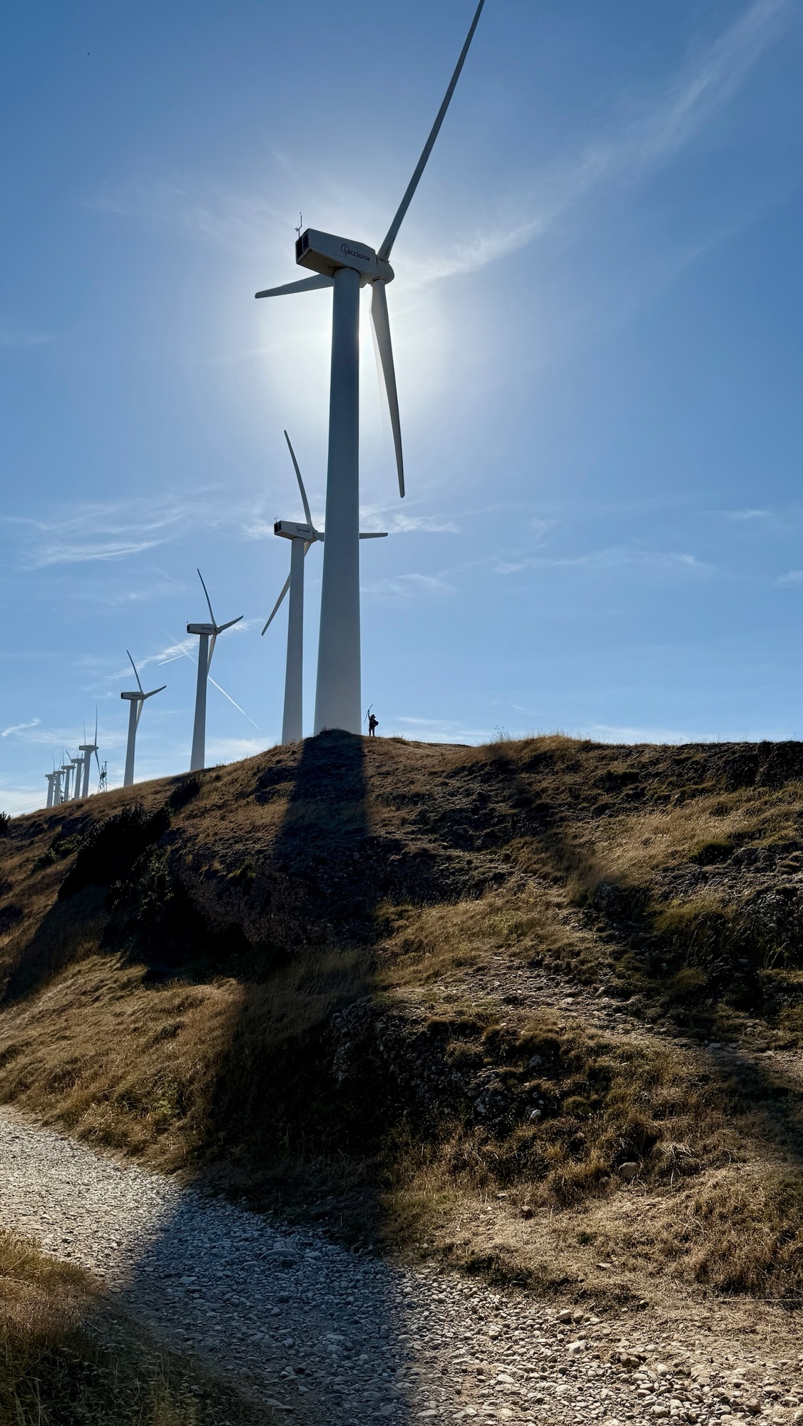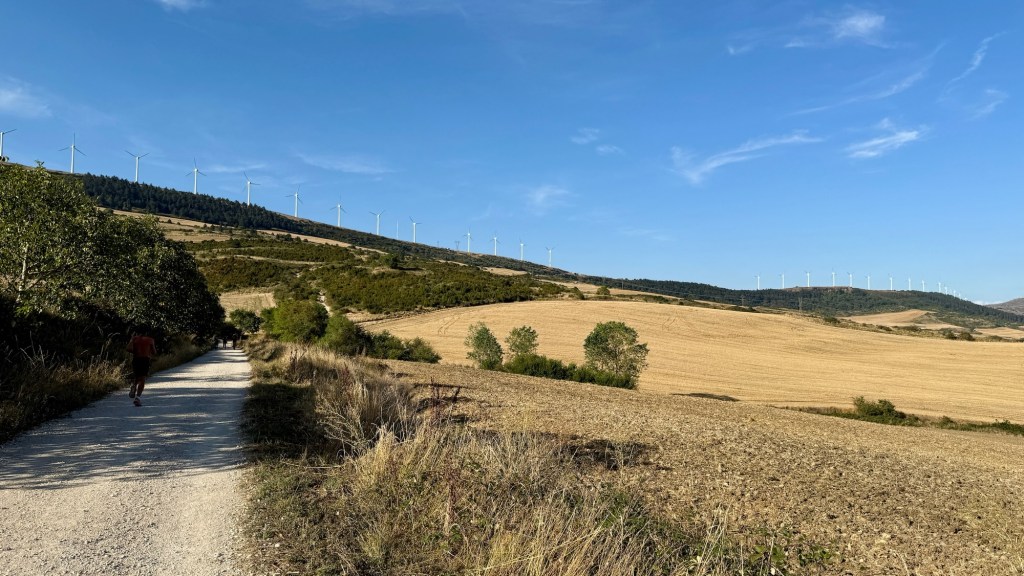 The next morning we left early, chasing cool air through Pamplona’s wheat fields as the sun rose. The trail climbed steadily into wide plains, the Pyrenees fading behind us. The highlight came at the ridge of wind turbines, their blades thundering overhead. Arya scrambled up a slope to touch one of the towers, locking in a memory she won’t forget.