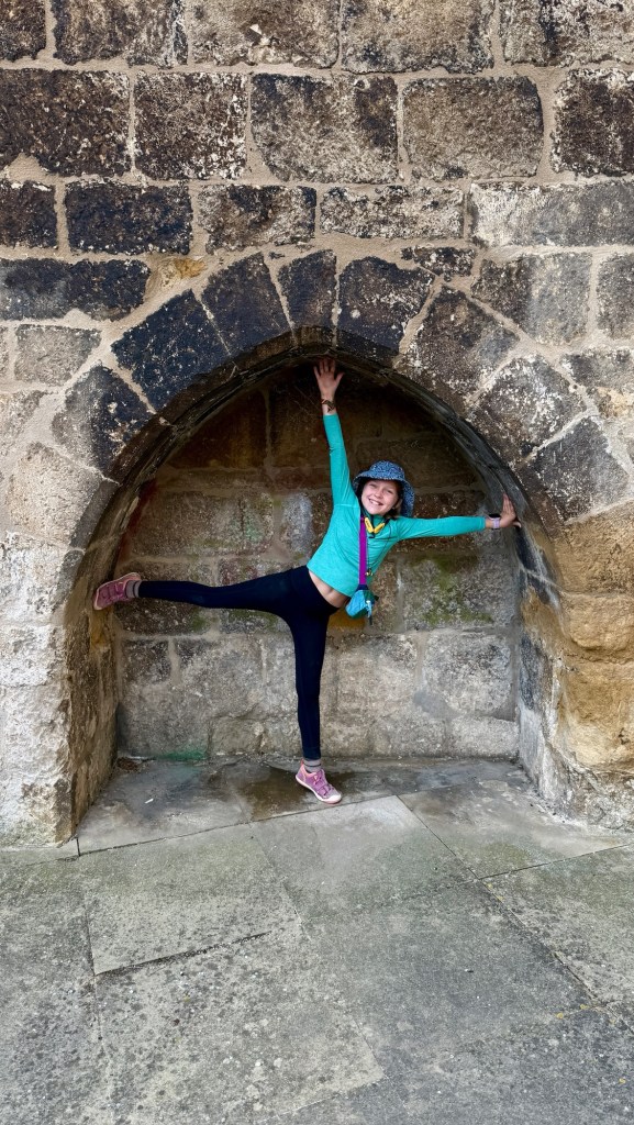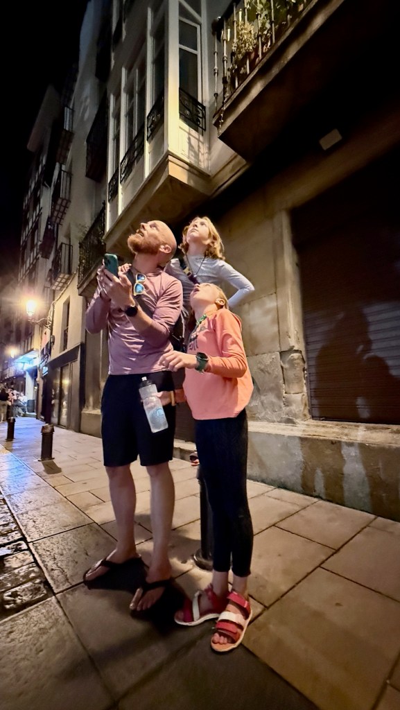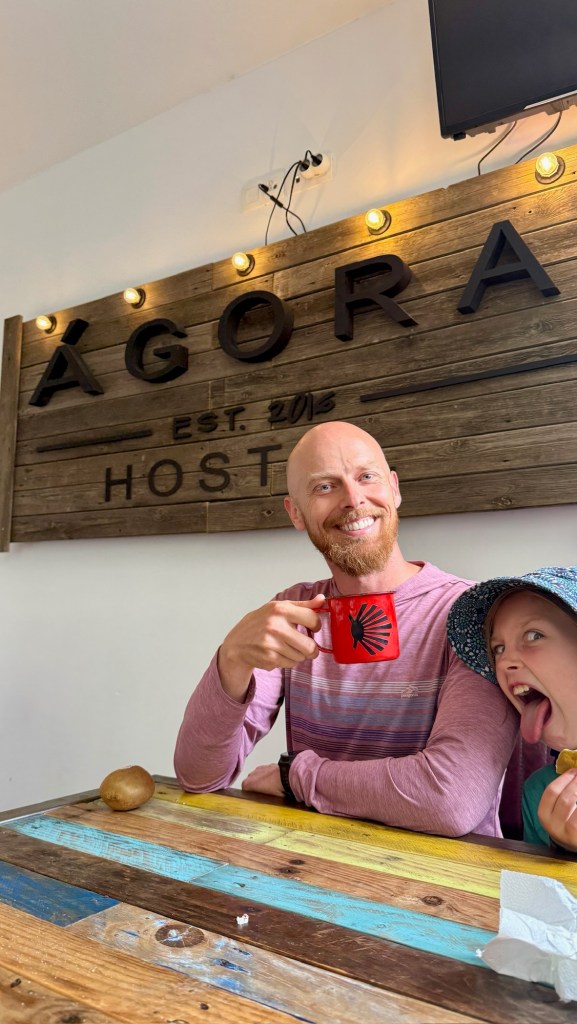 The next day, alarms rang at 5:15 for our longest walk yet: 22 km to Los Arcos. The terrain shifted from scrub oak to farmland to tiny villages, each climb opening to bigger horizons. The last 12 km, though stark and exposed, felt strangely magical. No shade, no water, no villages—just wheat fields stretching to the horizon, windmills in the distance, a ruined castle perched on a hill, rock formations bursting from the earth, and olive groves heavy with fruit. Shaina led the way, the girls walked beside Max, and joy bubbled over at the absurd perfection of it all. Max even found himself harnessing his inner Maui and shouting, “Can I get a CHEE-WHO!” into the wind. The euphoria was brief but unforgettable.
