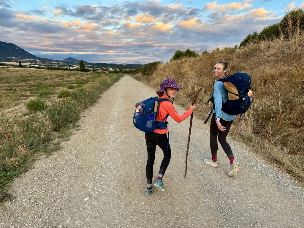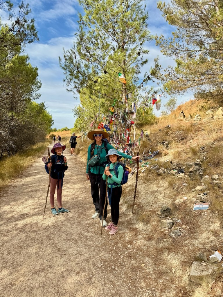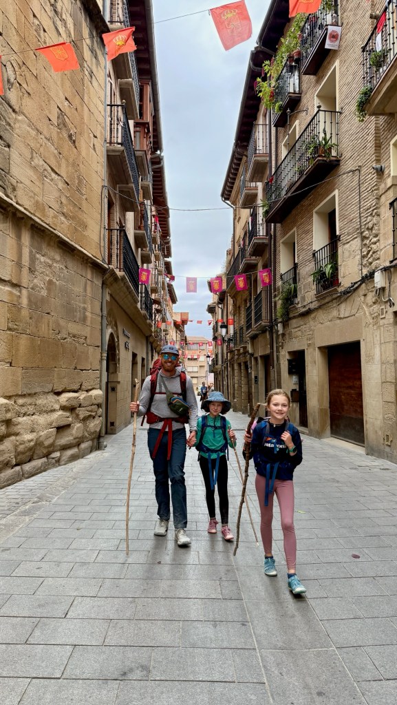 From there, the Camino stretched on—19 km to Viana, pleasantly under steady cloud cover. The highlight was an unexpected pine grove filled with cairns and tributes to lost loved ones. We paused there to leave a stone, and thought of Max’s mom, Dana, and all our friends and family we temporarily left behind for our adventure. The last kilometers were rough, walking shoulder-to-shoulder with semi trucks, until the girls spotted a playground at the edge of town. With seemingly endless stores of energy to buzz around a playground after a long day of hiking, they quickly reset the mood with pure joy.