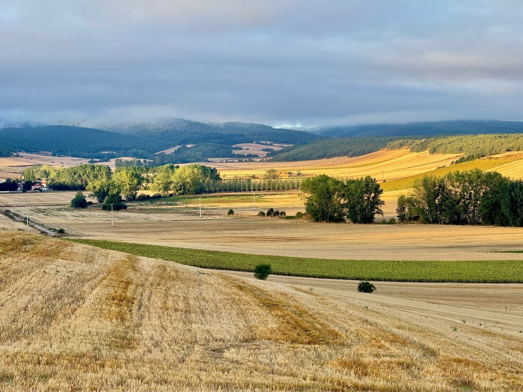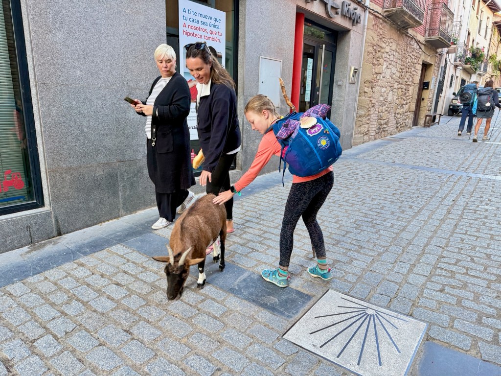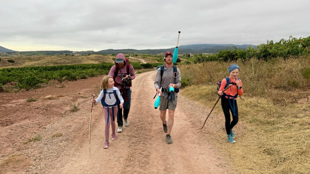 The next morning the girls set the pace and it was the quickest yet—about 5.5 km/hr. We fell into step with Don, an electrician from San Diego who somehow managed to juggle bright blue bowling pins while navigating the rocky path. The girls were wide-eyed, and truthfully so were we. Later we walked with Patricia, a retired Kiwi, who was delighted not just by the vineyards but also by the novelty of receiving drone footage airdropped straight to her phone. Encounters like these keep the miles from blurring together—every pilgrim carries a different story, and swapping them feels like collecting postcards for the memory box.