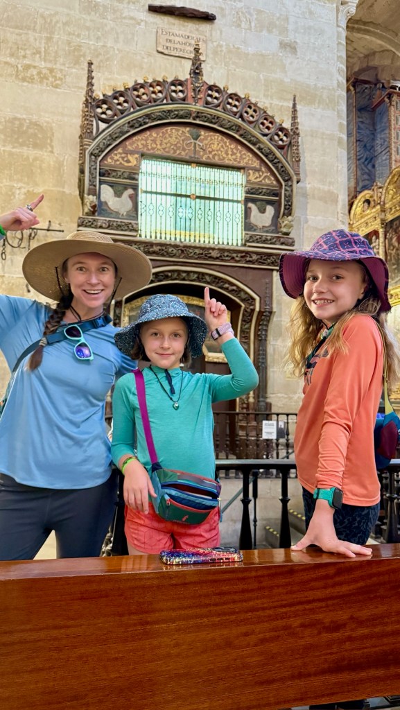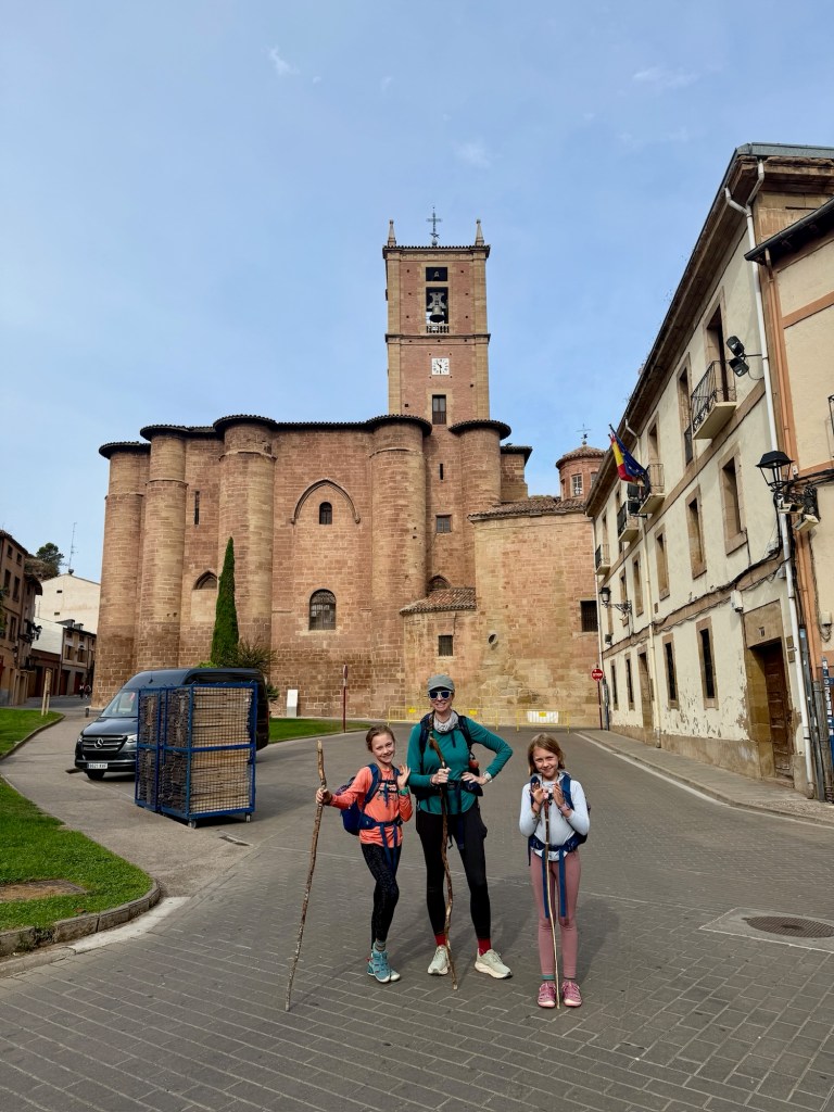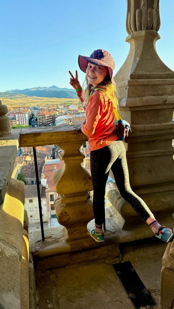 From vineyards to hay fields, the landscapes kept shifting. At one ridge we stopped at a golf club so overrun with spiderwebs and empty houses that it looked like the set of a bad sci-fi movie. Creepy as it was, the day ended in Santo Domingo de la Calzada, where cobblestones, a towering cathedral housing live “sacred” chickens, and the girls climbing a clock tower restored all the charm we could ask for. Seeing Arya and Finlee waving down from above while dinner simmered on the stove was one of those Camino moments that lands squarely in the “worth it” column.