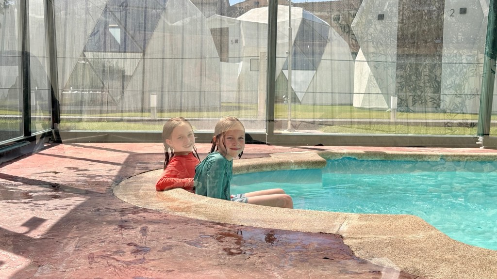 Not every day was so picturesque. Our longest walk yet—24 kilometers into Belorado—was spent almost entirely beside a superhighway. The soundtrack was semis instead of songbirds, but the girls powered through with the promise of cold sodas, and we all revived with ice cream or beer at the finish. This was topped only by the best surprise of the day: our albergue/hotel had a pool and the girls mustered up all the hidden energy they had after a long hot day to play for a couple more hours in the chilly water. The sound of children giggling was pure joy, and music to the ears of tired pilgrims relaxing in the garden.