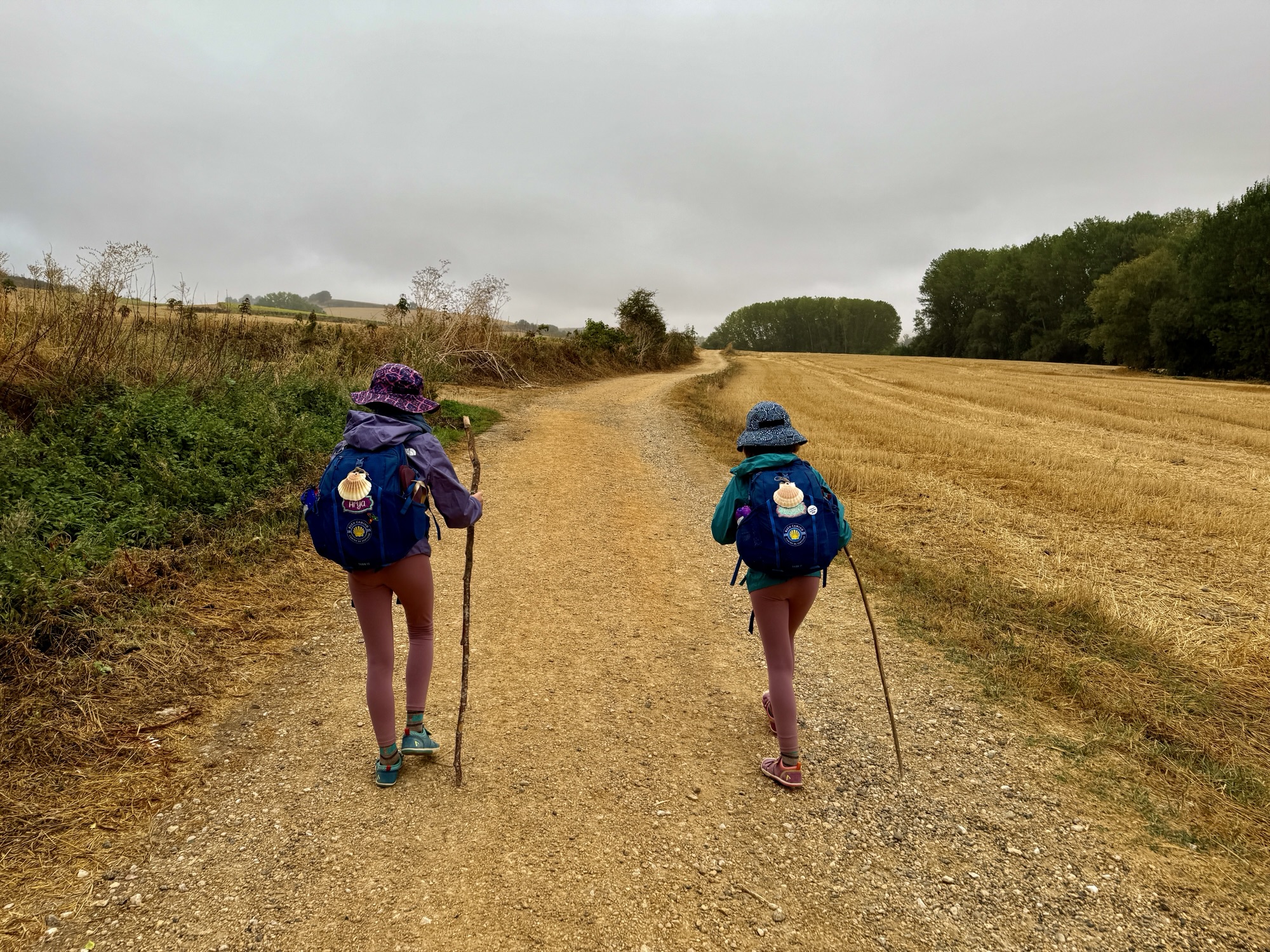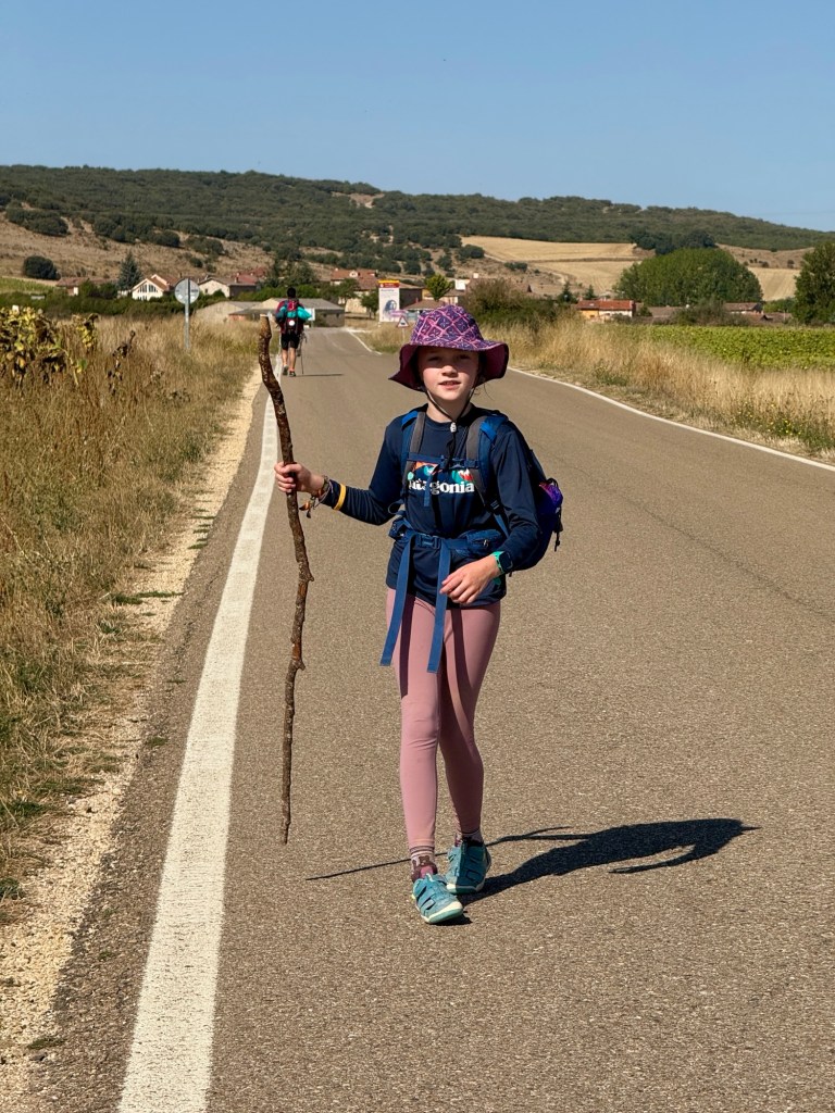 Not every day earns a coin, a clown-nosed barista, or a cathedral spire. Some are just steady walks across fields with the sky overhead and the road underfoot. Surprise snacks become small miracles—almonds and wafer cookies, Snickers bars and Fanta. Games pass the kilometers, like alphabet categories where we argue whether a quokka really exists or just something Arya made up. Both girls have started relishing in their ability to speak Spanish, and since it is unfortunately not the primary language on the Camino, they chat up locals and the occasional other pilgrim. Arya also surprised us with her confidence in French, seeking out conversations whenever she gets the chance, while Finlee has turned her walking stick into a whittled masterpiece, carving designs at every stop.