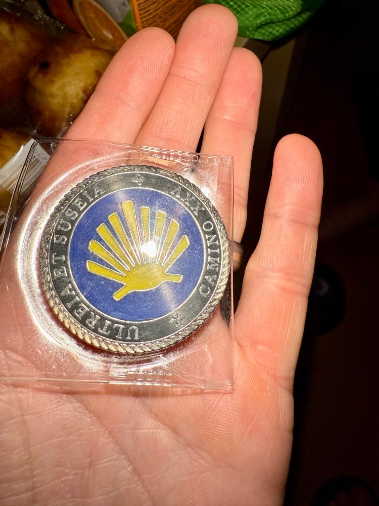 Later that day in Villafranca, we crossed paths with Kevin, a veteran pilgrim from Minnesota on his fourth Camino. He arrived with a booming laugh and a stash of custom-made coins that he gives out sparingly to pilgrims he calls “standouts.” He handed us one with a wink and declared us “the world’s most totally awesome parents.” We’re not keeping score, but that kind of accolade is hard to beat. We spent the evening on the hotel patio, playing Hearts with the girls while a Spanish musician switched between saxophone and harmonica. His singing left something to be desired, but when the sax started up, Shaina and I couldn’t resist getting up to dance.