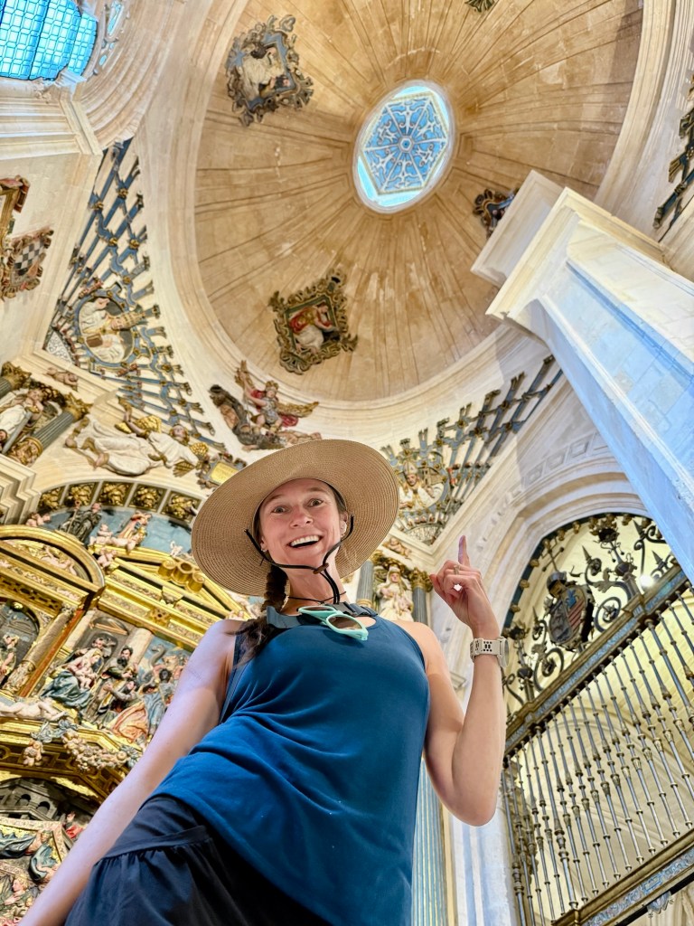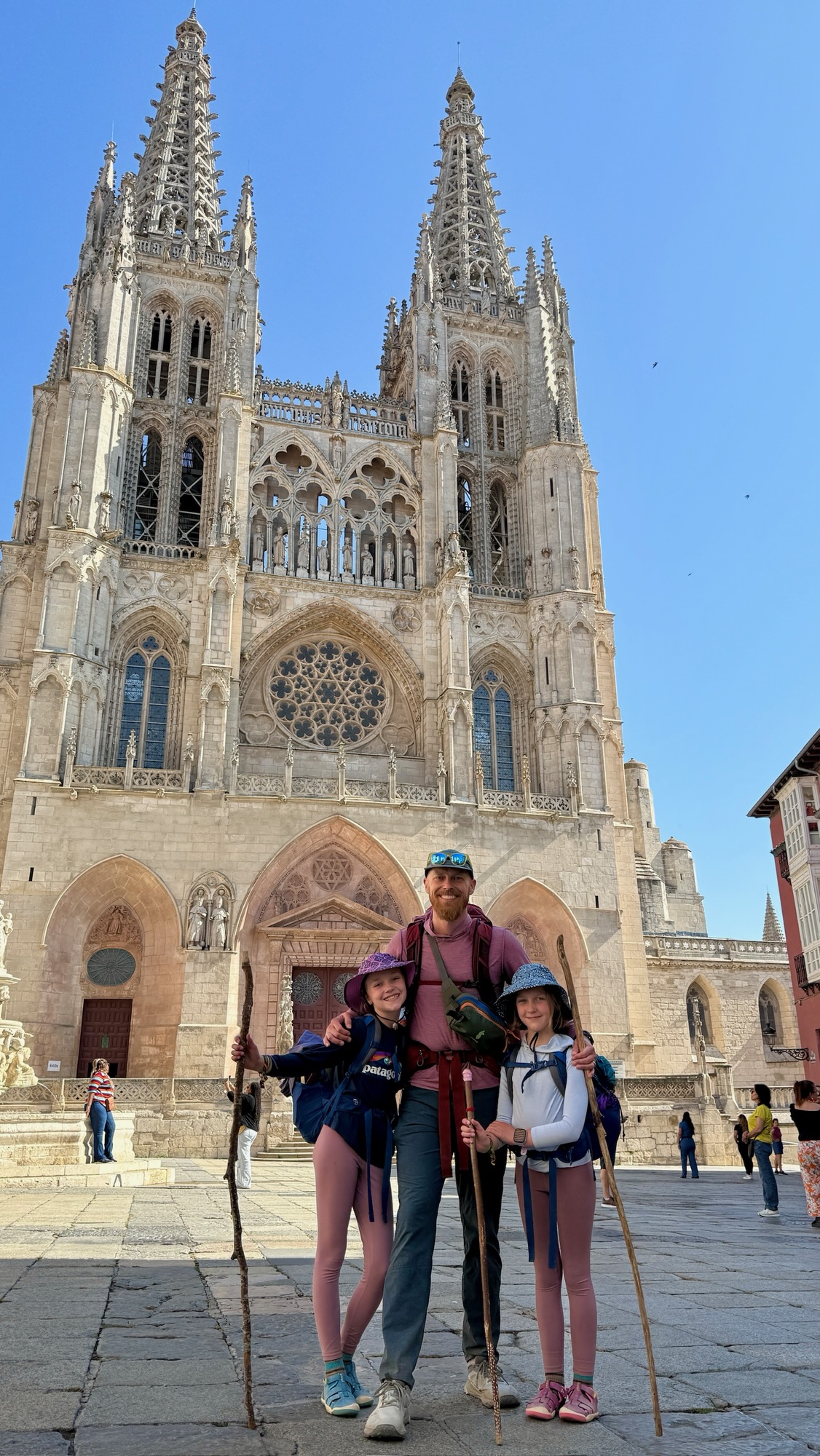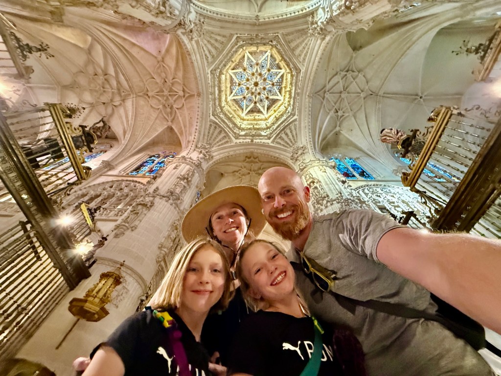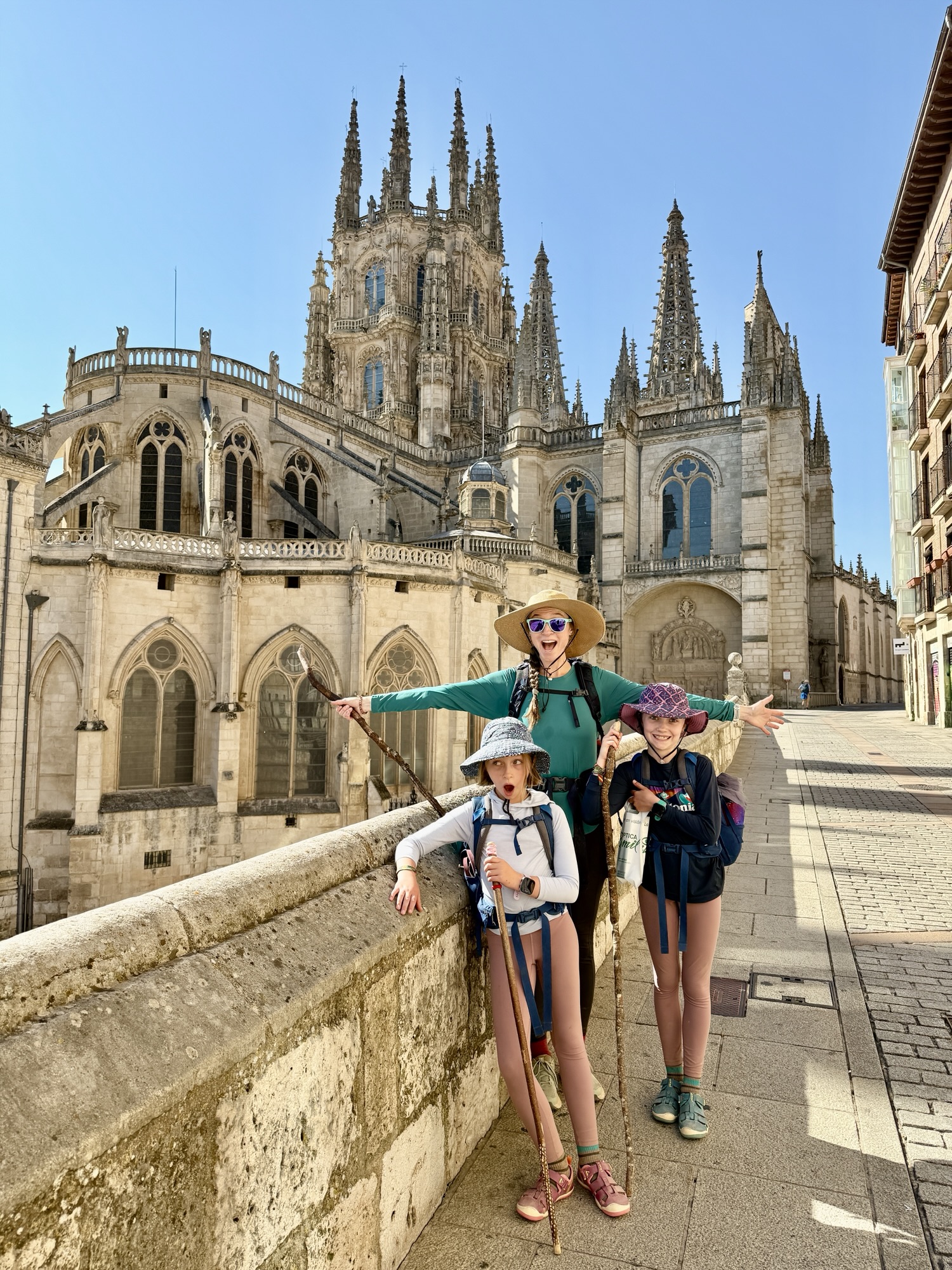 The walk into Burgos brought another round of contrasts. We had been warned about the two routes: one slogging through industrial sprawl, the other a longer meandering path along the river. We chose the river and were rewarded with a shaded path alive with joggers, cyclists, and rollerbladers who made us feel like part of the city before we ever reached its heart. Burgos itself dazzled. The cathedral’s Gothic spires stabbed the skyline, and inside the 300-year timeline to complete it was apparent, as chapels swung wildly from austere to gilded, medieval to Renaissance. Even the girls were impressed, craning their necks alongside us to glimpse the Papamoscas or El Cid’s tomb. But when we wandered out and found a gelato shop miraculously still open during siesta time, the cathedral quickly had competition. Arya declared her ice cream “OMG amazing!”
