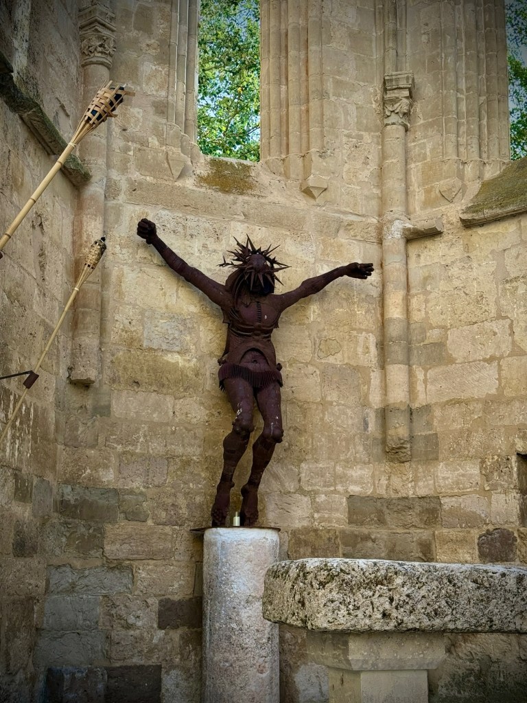 The girls immediately dropped to the ground, sifting through gravel for bits of stone streaked with pink or green. We stood nearby with our Camino friend Kelli, catching up, until our eyes landed on a steampunk-looking crucified Jesus mounted inside. The mix of sacred and surreal made us shiver.