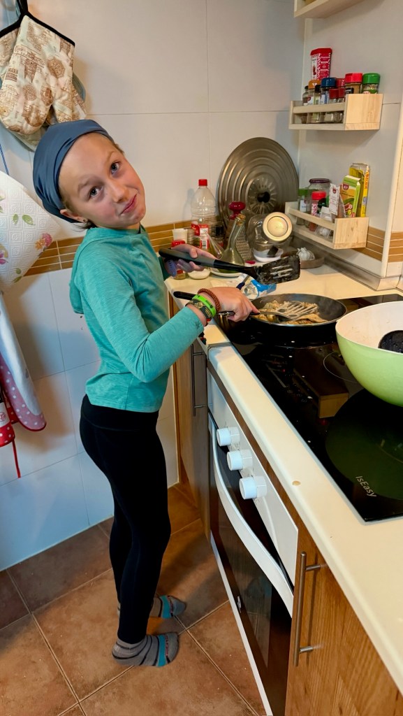 Our albergue, Juntos, was run by a kind Dutch couple. Finlee invited herself into the kitchen to chop, mix, and deliver plates, proudly sharing her homemade cucumber-tomato salad recipe with the hosts. Dinner was communal, a long table filled with pilgrims swapping stories. Arya dazzled two French women with her language skills (“but she has no accent!”), and we felt a small glow of pride for how resilient the girls had been, not just that day but on the Camino as a whole.
