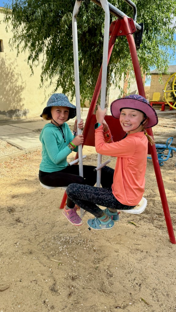 For Arya and Finlee, the news landed like a stone. Finlee groaned loudly that her feet were “totally destroyed,” and Arya looked ready to stage a revolt. The mood shifted fast. That was when we turned to the oldest parenting trick in the book: bribery. Dessert first (ice cream to the rescue!), followed by a quick meal of chicken, fries, and Fanta, were enough to lure them forward. Fueled and slightly restored, we shouldered our packs again. Of course, 50 meters in they saw a playground — “sure kids, of course we have time for a quick play sesh!”