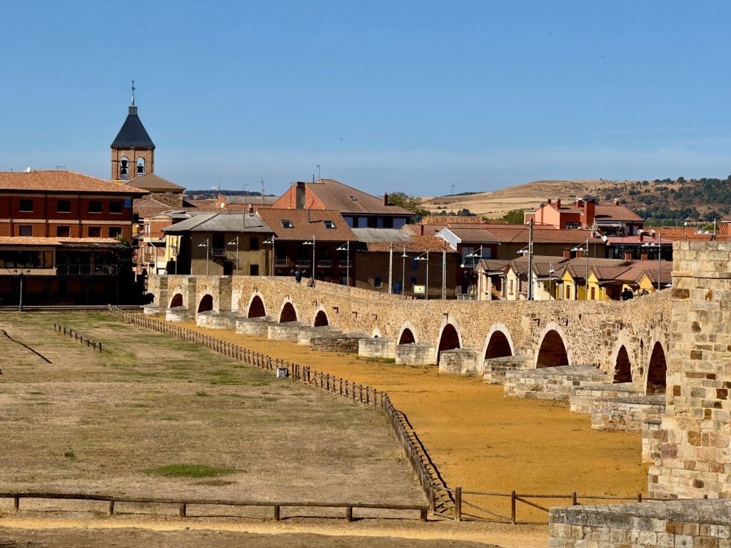 The Camino has its own way of timing reunions. Just when the straight road seemed endless, we spotted Hilda and Ben. Hilda, recovering from injury, was walking again, carefully but determined. Later, Olivette reappeared, someone we hadn’t seen since our first night in Orisson. We crossed the medieval bridge in Hospital de Órbigo together, its stones echoing with the history of knights who once fought for honor there. Now it was just us pilgrims, tired but smiling, pausing to take drone shots and tell stories before drifting apart again.