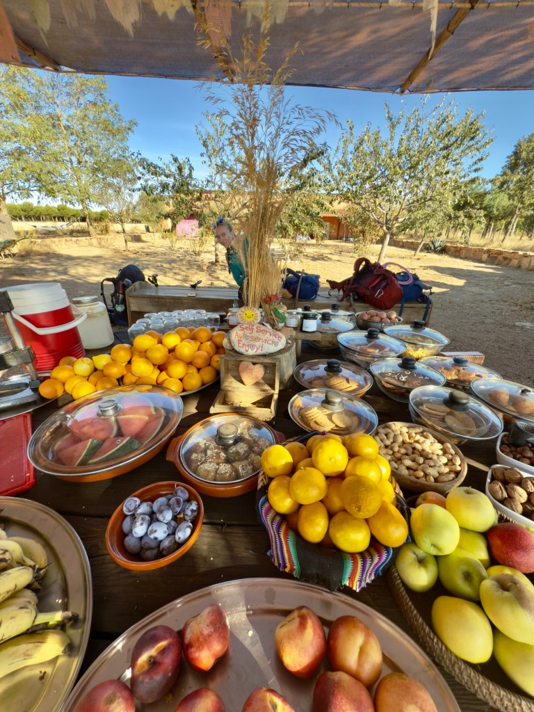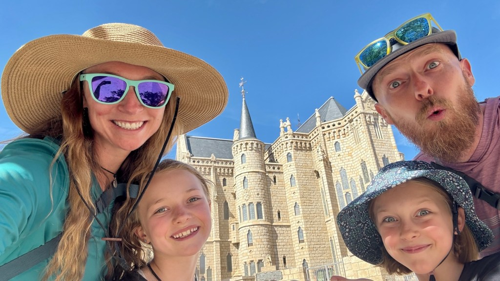 Astorga brought fresh discoveries. On the way there, we stopped at the Jardín de Alma — the Soul Garden — where fruit, nuts, bread, and fresh-squeezed juice were set out without price tags, just trust and a box for donations. We lingered there, grateful for food and for the kind of generosity that makes strangers feel like kin. Later, the small city surprised us in its many treasures. The cathedral’s façade provided a perfect template for a game of “I Spy”, packed with angels, mermen, and a tiny hidden castle all twisting skyward. Gaudí’s granite palace rose like something from a fairytale. We cooked our own feast that night, simple pasta and salad, rounded out by a four-euro Rioja, proof that comfort doesn’t have to cost much.