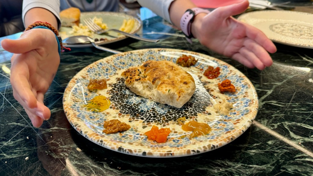 Our last morning in Istanbul began with all the confidence of people who believed they had nothing left to remember. We sat down to a Turkish breakfast at Casius Antioch Kitchen Restaurant—nineteen tiny dishes arranged like edible confetti, a carbohydrate parade of pide and baguette slices, sweet and savory toppings that made us briefly forget that life contains responsibilities. We ate like travelers who had completed their checklist, wrapped their loose ends, and were simply savoring the moment. We devoured everything; Missi enjoyed nearly all of it; the girls tolerated about 50% but loved the novelty.