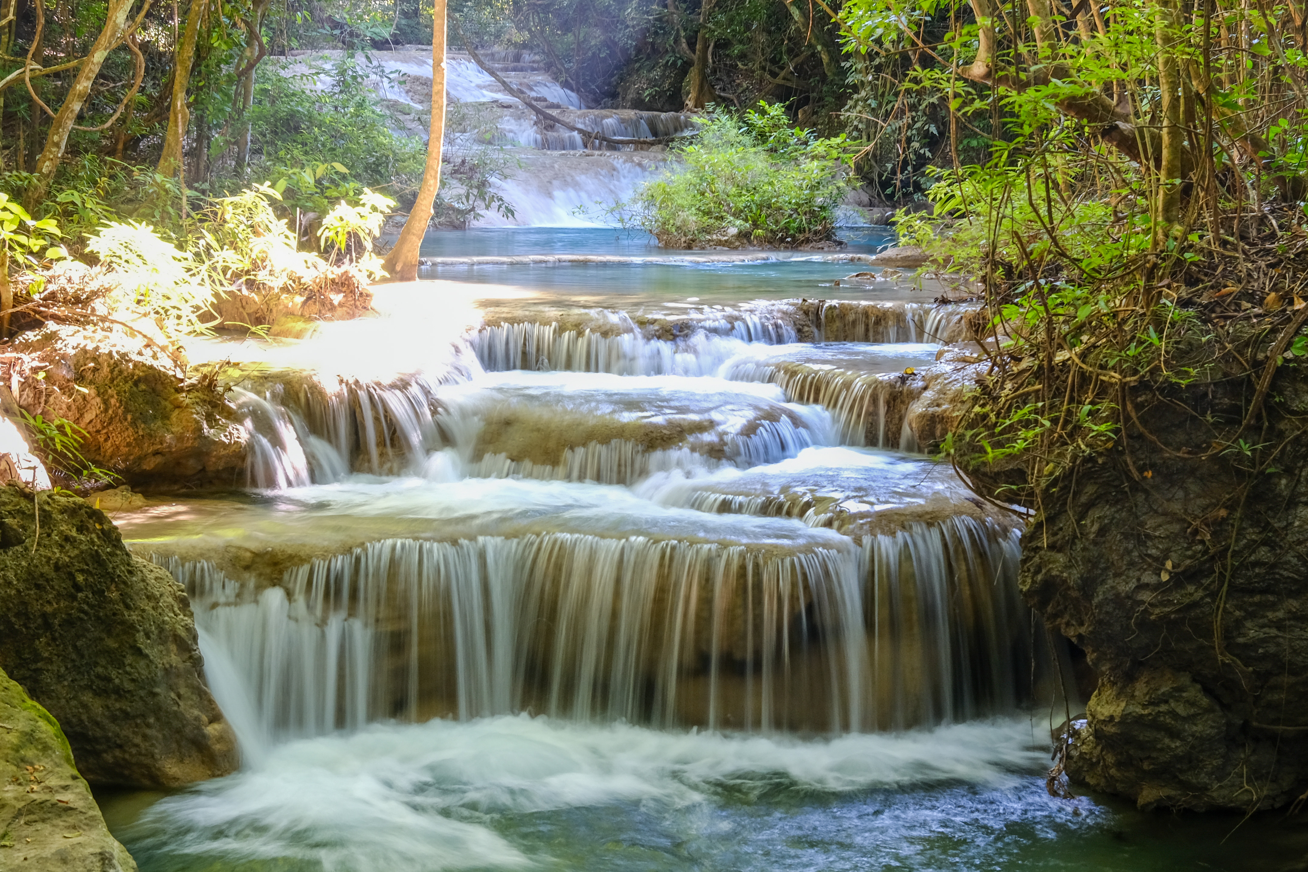 Erawan is famous for its seven-tiered waterfall system, named after the three-headed white elephant of Hindu mythology. We hiked what must’ve been the longest 2 kilometers ever, uphill alongside a river that cascaded through pool after pool of teal green water. The mineral-rich water has created striking limestone formations and smooth terraced basins that look almost unreal. It is an absolute dream for photography. With steady hands and a long exposure, the water turns silky and the results feel postcard-perfect.