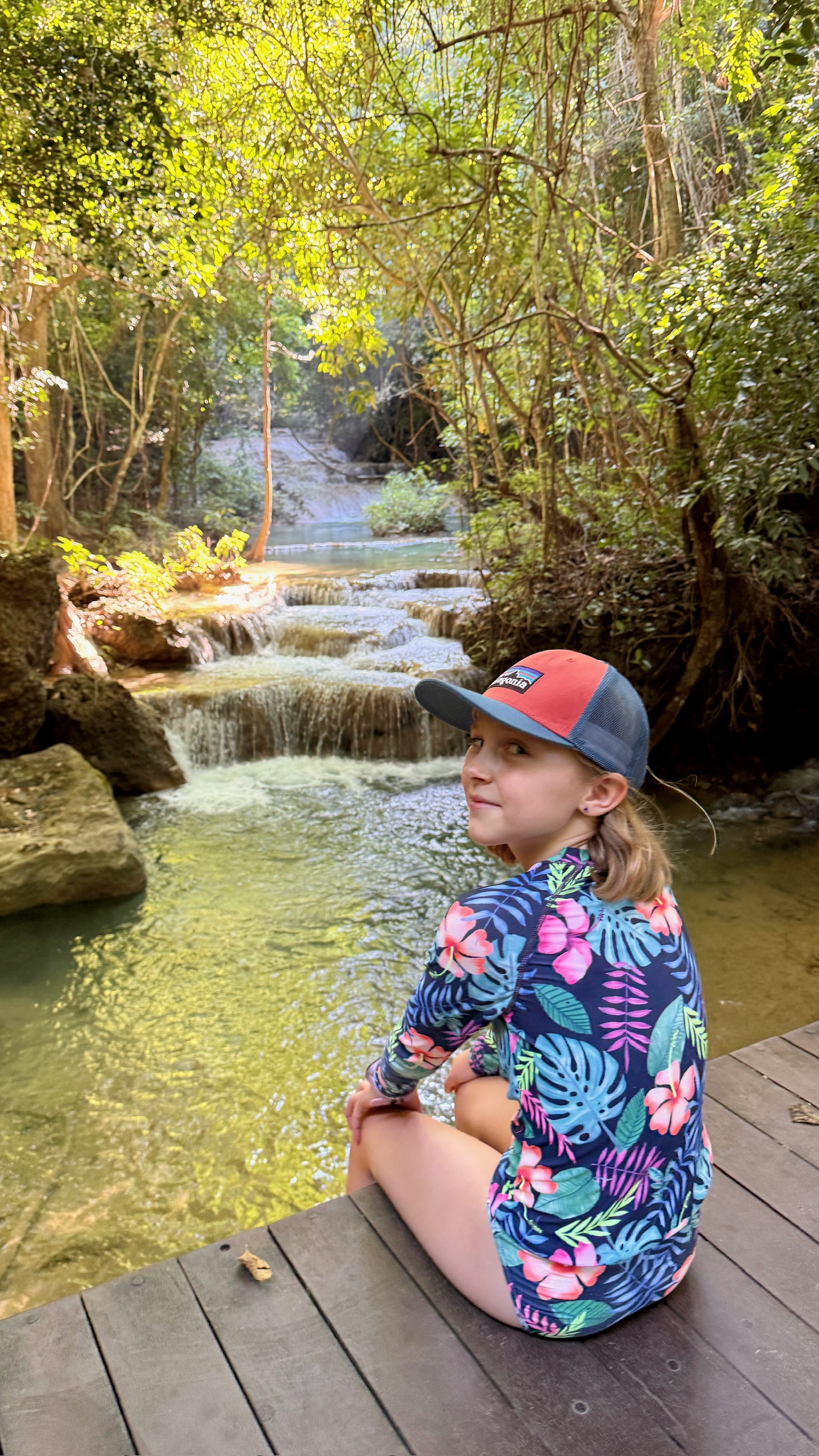 Unfortunately, timing worked against us. Just as we reached the upper levels, access started closing. It felt like we had only 17 seconds to explore before we were being ushered back down. Arya and Finlee were especially disappointed that there was no time to swim beneath the waterfalls, which had been what they were most excited about. They got quick dip under their belts before the park rangers herded everyone back toward waiting vehicles, and while the visit was undeniably beautiful, we would not recommend pairing Elephants and Erawan in the same day unless the goal is simply to check boxes rather than explore deeply.