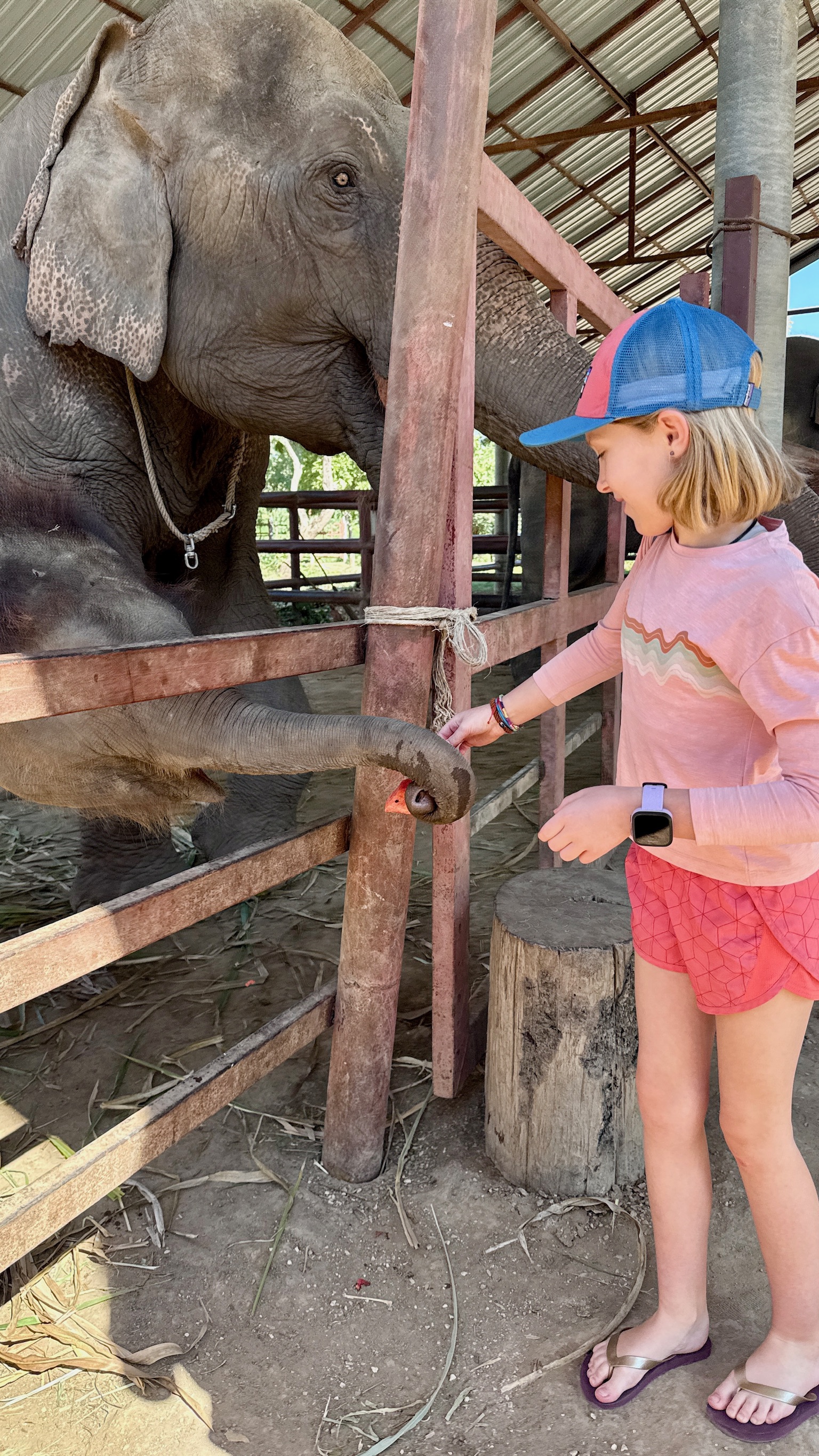 We fed them sweet potatoes and watermelon under a shaded pavilion, and it was immediately clear how remarkable their trunks are. They reached out, sniffed, felt, and curled the tips around food with astonishing precision. Arya surprised us by being timid at first, which was unexpected given how brave she usually is. Finlee surprised us even more by doing the exact opposite. Our child who is usually afraid of butterflies walked straight up and started feeding elephants confidently from the beginning, no hesitation at all.