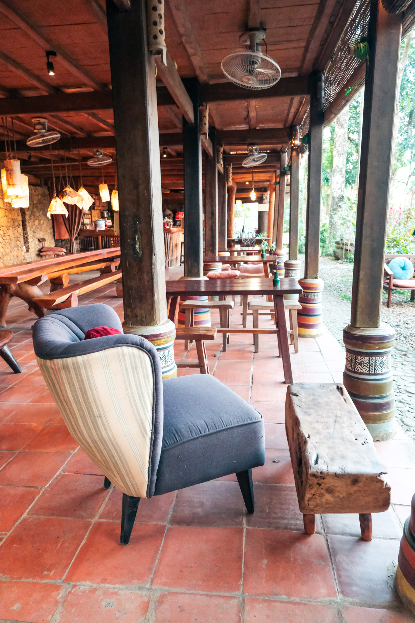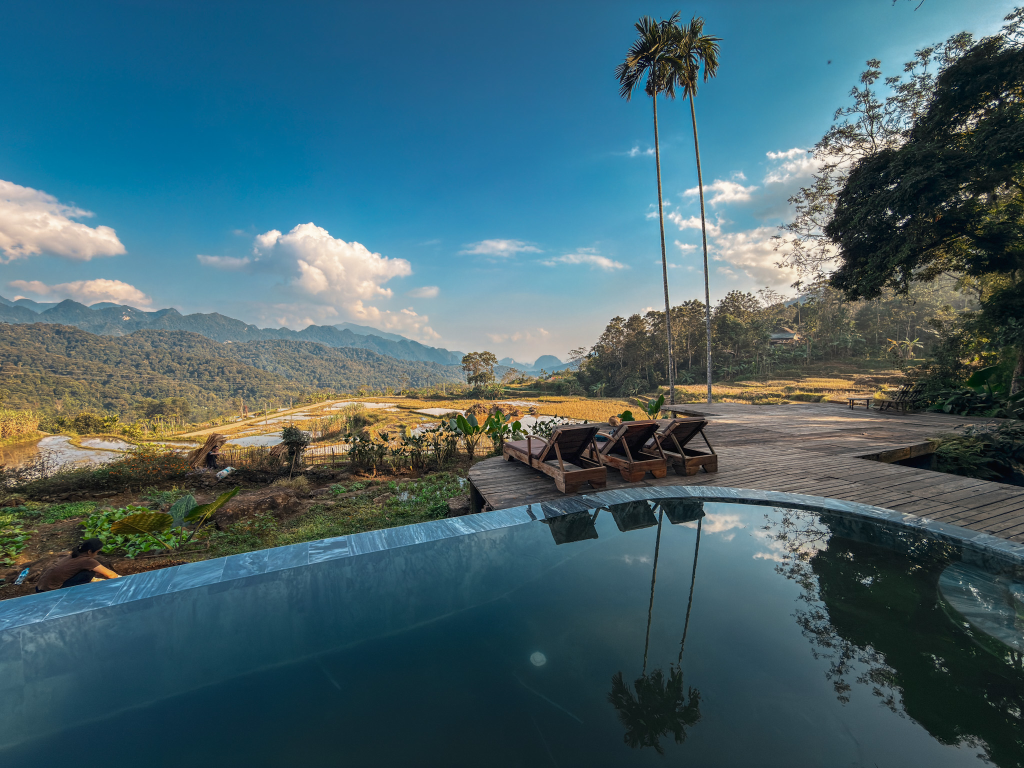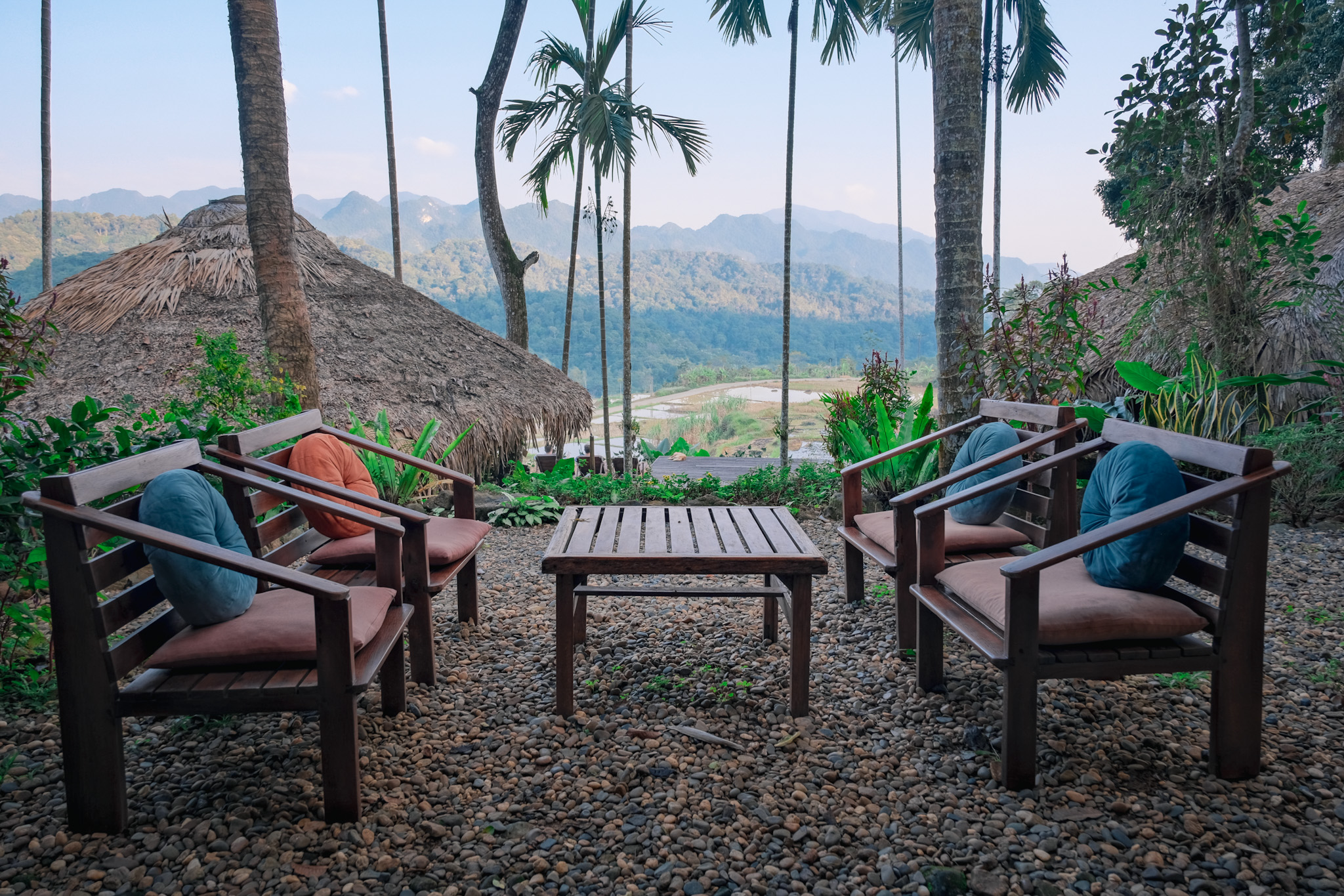 The property itself encouraged slowing down without announcing that intention. About 10 stilted bungalows built from heavy timber and bamboo, banana leaf thatching overhead, winding stone paths connecting everything in a way that rewarded wandering rather than efficiency. Mornings and evenings were crisp, cool enough to make the fireplace in the communal main lodge feel necessary. Only for a few hours in the middle of the day did the sun reach far enough into the property to warm things up. There was an infinity pool overlooking the vegetable garden and paddies below, beautiful but unheated. We swam once, briefly, and laughed about how fast everyone got out.
