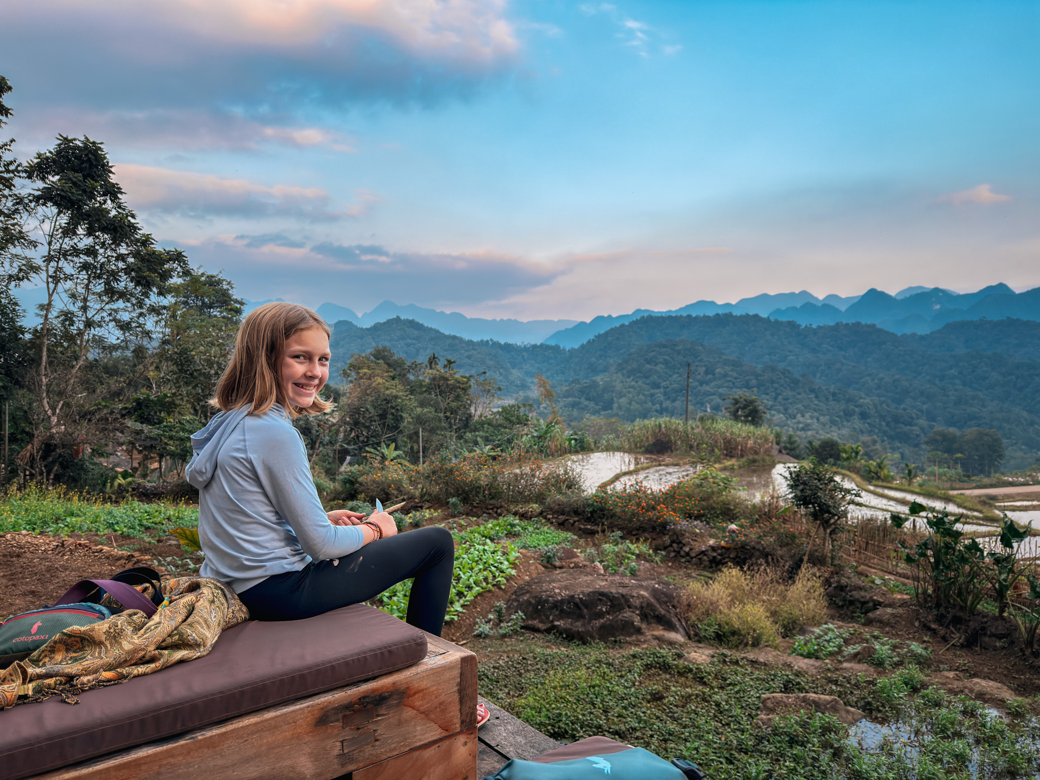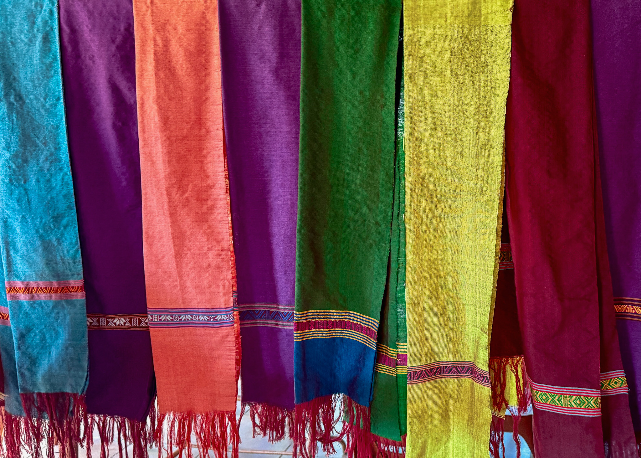 In Chom Lan, we wandered through the village, watching women work at looms set up beneath stilted homes, the steady rhythm of weaving matching the pace of the place itself. We bought 3 brocades, pieces we liked enough to carry with us for the long haul. That alone felt notable. By the time we parted ways and started the steep climb back out of the valley, the girls were buzzing.