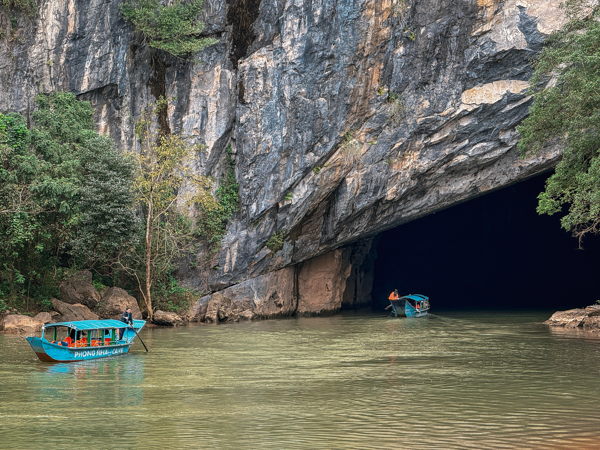 We paid our entrance fees, split the cost of a boat, and climbed aboard long, narrow wooden craft powered by surprisingly loud engines. As we moved upstream past town, a massive cliff face appeared ahead of us, split open by a triangular void. As we approached, that opening narrowed dramatically, shrinking to a low slit just inches above the roof of our boat. At the last moment, the engine cut. Silence fell instantly. The crew switched to oars and guided us inside with inches to spare. The relief of quiet was immediate and profound.