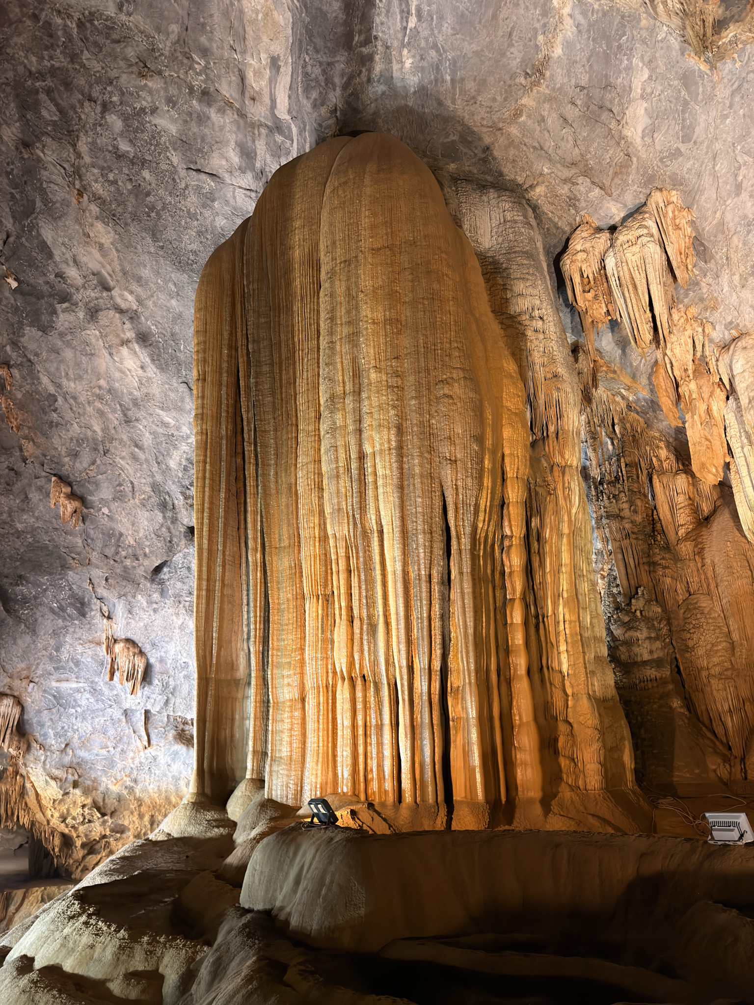 Paradise Cave revealed itself quietly at first, a small, unassuming hole in the mountainside that gave no hint of what waited inside. Then we stepped through the opening and the space exploded open. Enormous does not even begin to cover it. The first chamber was so vast that it felt like standing inside a natural cathedral. You could fit the Taj Mahal inside it easily. Probably two. Maybe three. The ceiling soared overhead, the walls were fully illuminated from edge to edge, and the scale immediately overwhelmed any sense of proportion. With every corner lit, there was nowhere for the size to hide, which somehow made it feel even larger and harder to comprehend. Massive natural columns rose from floor to ceiling, some fused together over ages into single towering structures. Flowing stone cascaded down the walls like frozen waterfalls, and everything carried the weight of deep time.