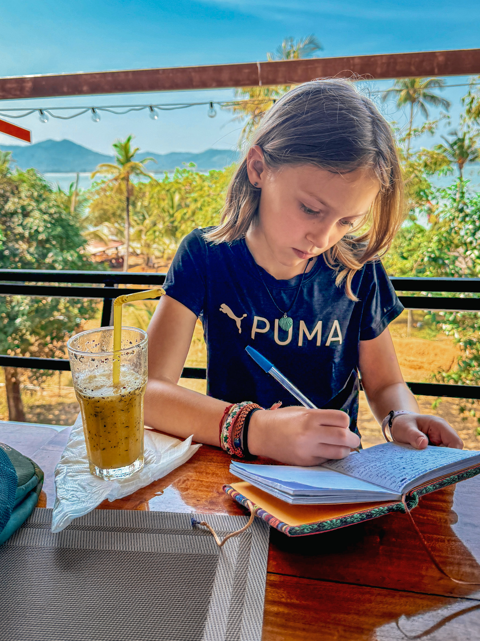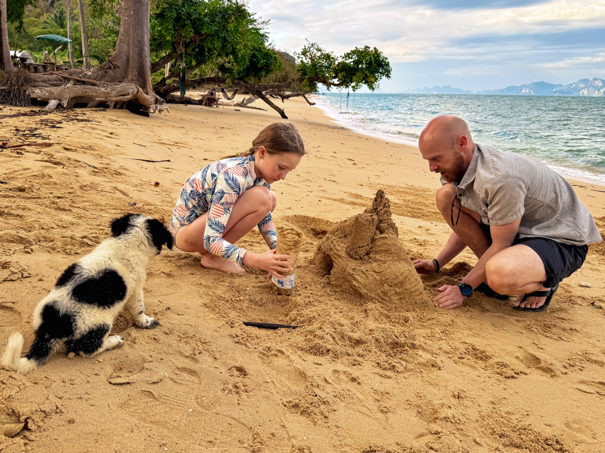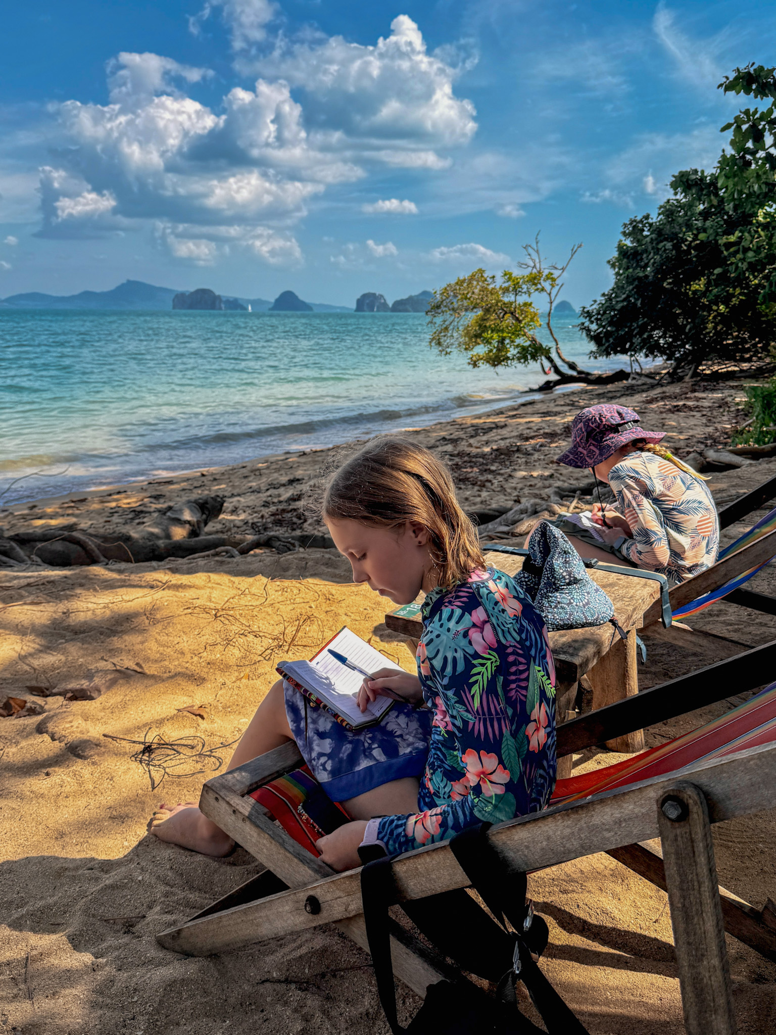 We settled into our favorite spot facing the sea in sling chairs, ordered a large Chang beer to split, and sent the girls out to build epic sand castles while we journaled and talked. The afternoon unfolded slowly this way—occasionally ordering passion fruit and mango smoothies, writing, helping with sandcastles, taking dips in perfect-temperature water, then starting the cycle over.