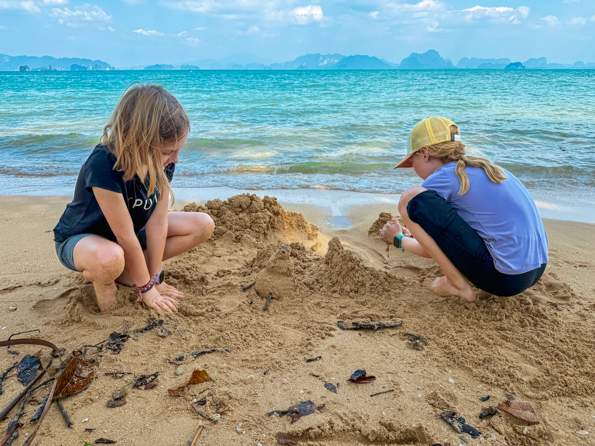 Near the northwest end of Koh Yao Noi, we found Long Beach and Three Ladies Restaurant: a rustic bamboo outdoor kitchen with equally rustic furniture scattered about, all facing azure blue water dotted with karst islands that looked straight out of The Beach. The area was ringed by palms and fig trees providing ample shade. Only a handful of people had ventured this far. The girls built sandcastles while we enjoyed pad Thai, spring rolls, and vegetable stir-fry.