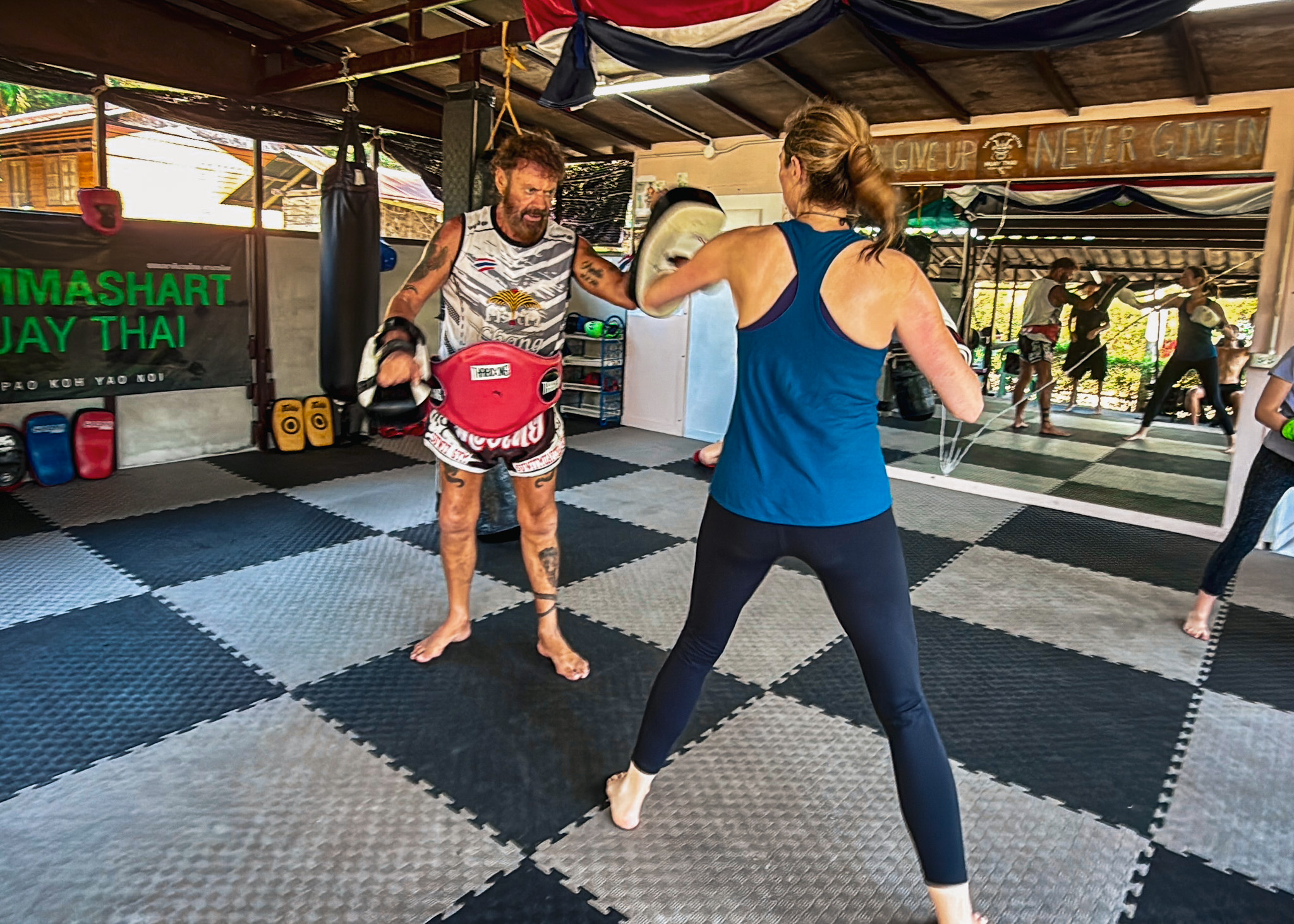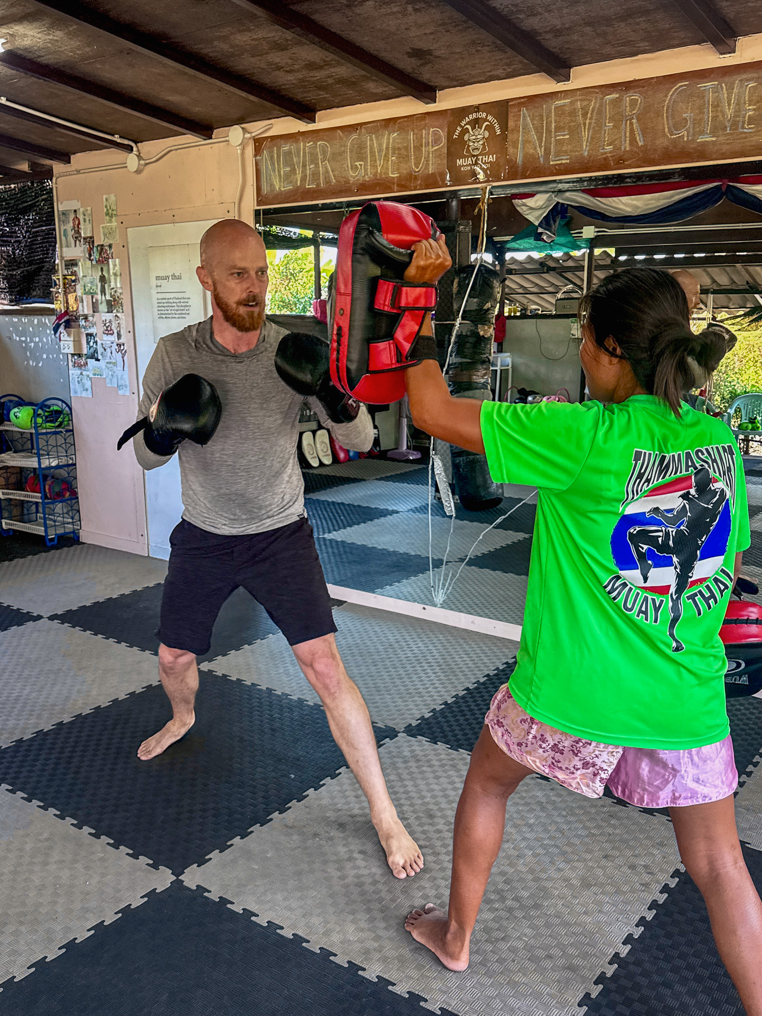 We woke early the next day with another full plan: scrapping kayaking entirely in favor of another Muay Thai session, homework, and afternoon at the beach. The workout was excellent—explosive exertion leaving us tired but somehow ready for more. Unfortunately, Shaina tweaked something in her upper back between her shoulder blades, either from enthusiasm or from her motorbike fall the day before. A massage would be needed sooner rather than later.