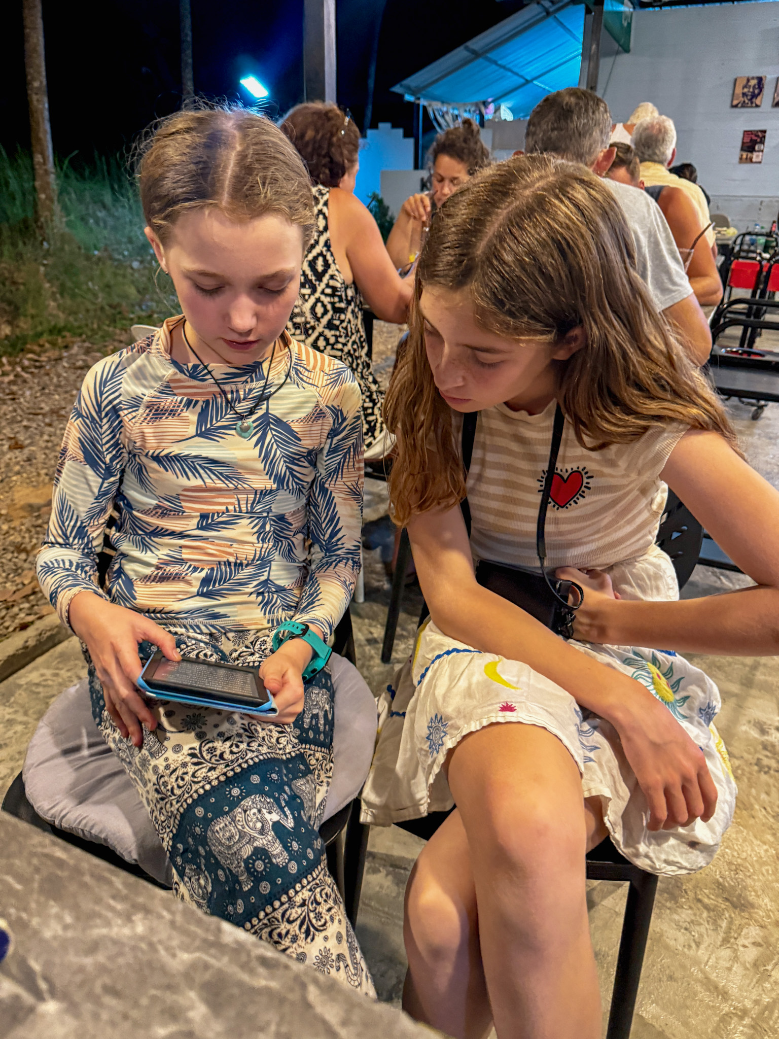 We arrived at dinner forty-five minutes early after yet another turn in the weather, not wanting to ride scooters on steep dirt roads in the dark. We played card games before Poppy and crew arrived. We took up two tables—kids at one, adults plus three-year-old Rocky at the other. It was another great meal and really good conversation with interesting people.