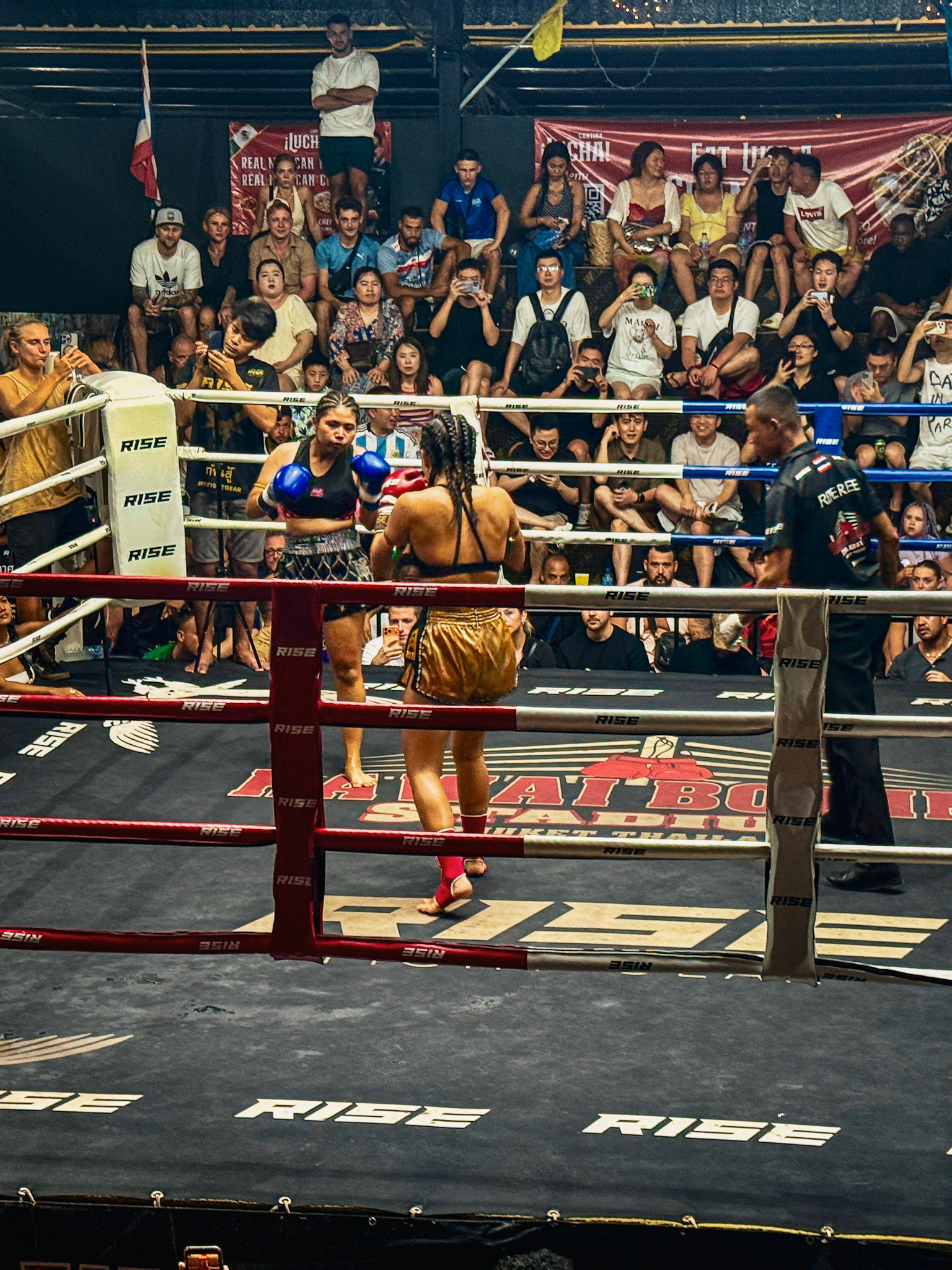 The next fight was different. Two young girls, probably around 11 or 12. One Thai, the other Swiss. From the start, the outcome was never in doubt. The Swiss girl came out swinging without holding back. The Thai girl seemed overwhelmed immediately. Within 30 seconds she was on the ropes taking hit after hit without being able to defend. The referee stepped in and stopped the fight.