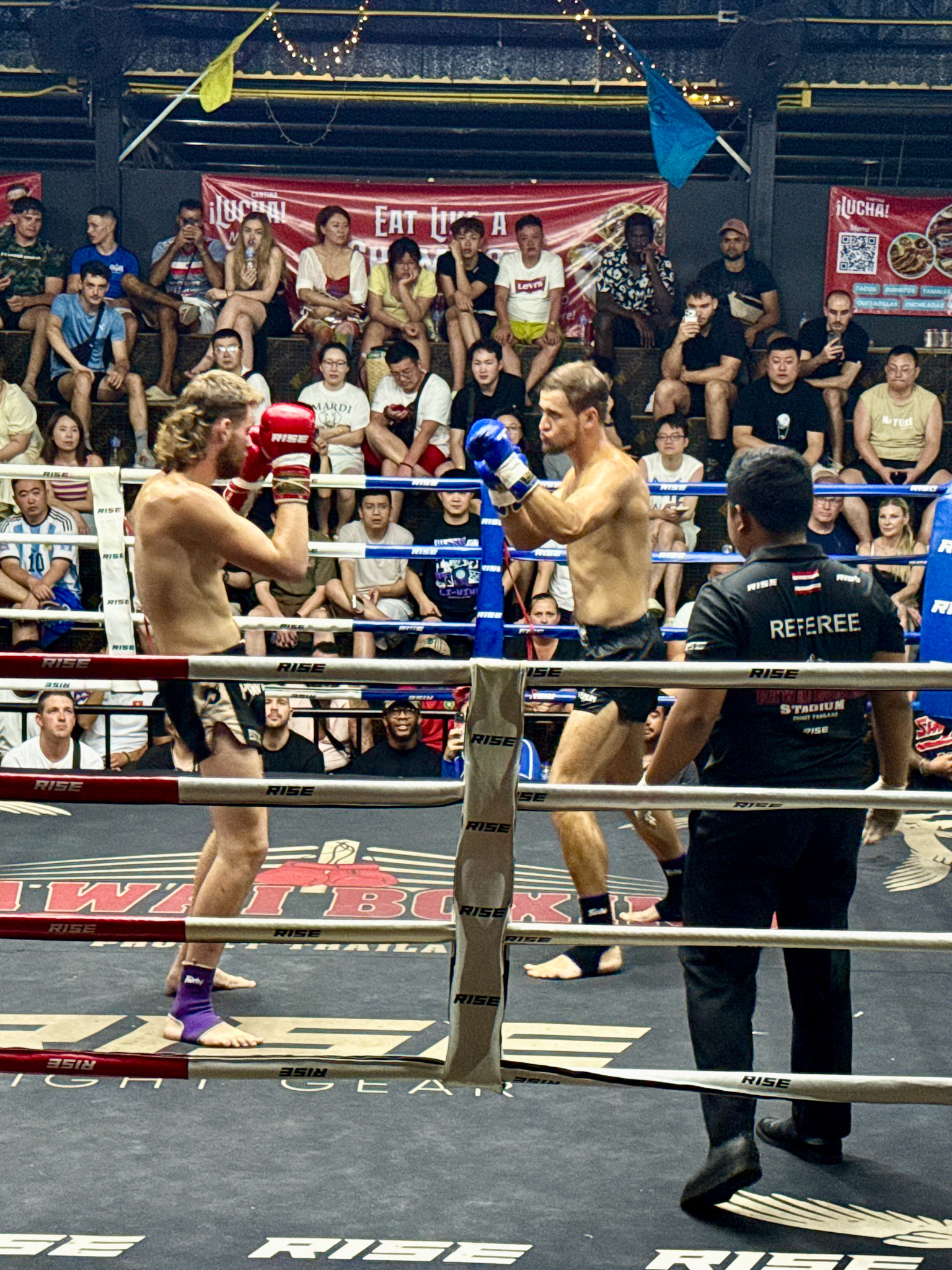 We’d bought basic bleacher seating instead of their VIP or ringside seats, and that proved to be right call—the view was great. Before each match starts, there’s a lovely ritual where fighters perform the Wai Kru Ram Muay, a ceremonial dance where they pay respect to their teachers, the sport, and the ring itself, moving gracefully to traditional music while wearing sacred headbands called mongkons that are believed to bring protection and good luck.