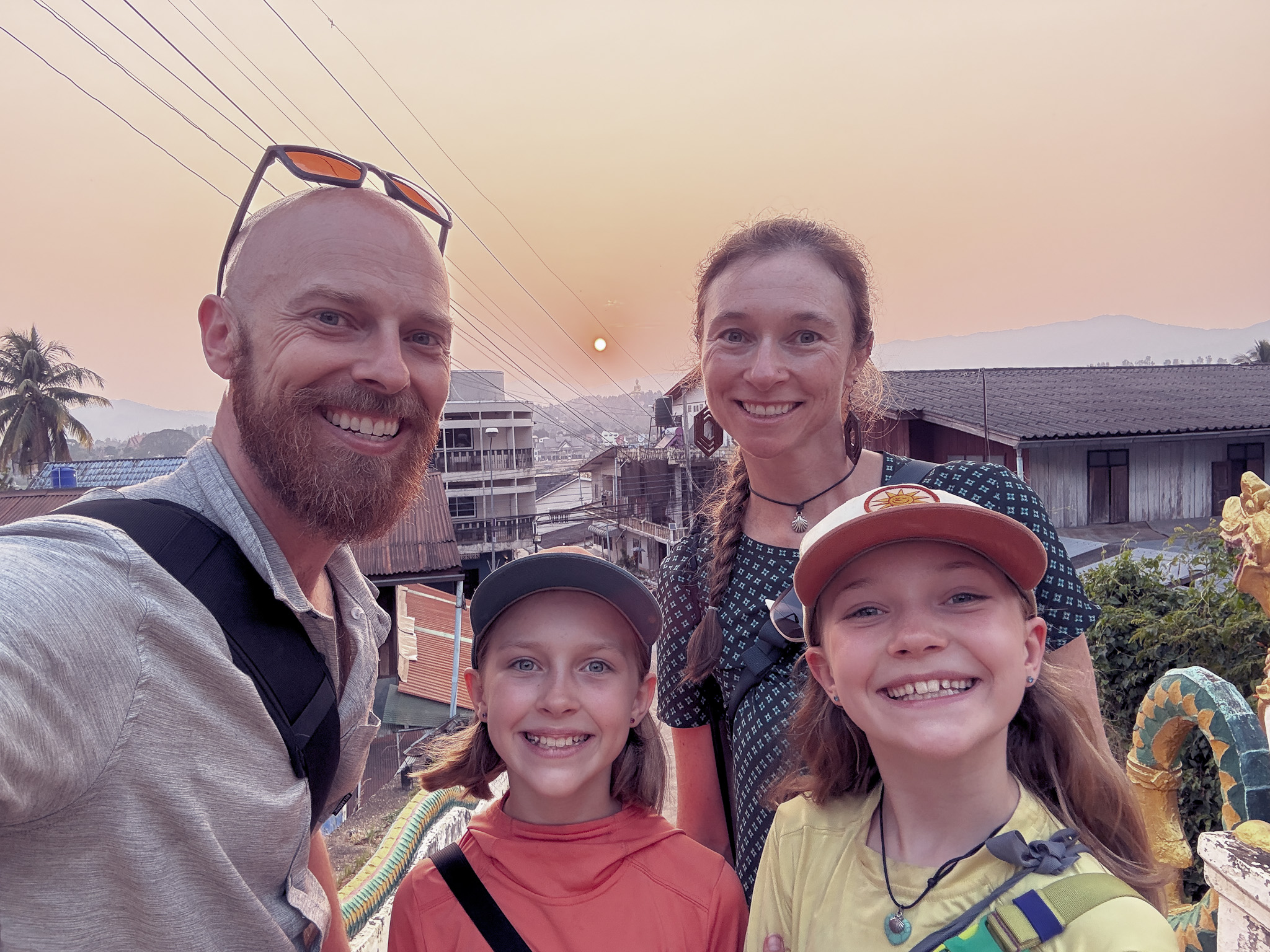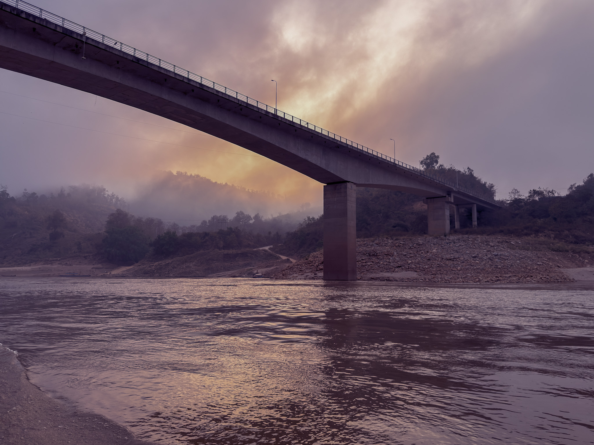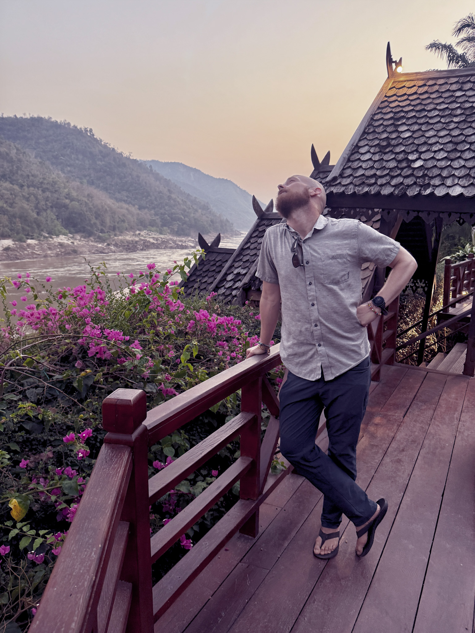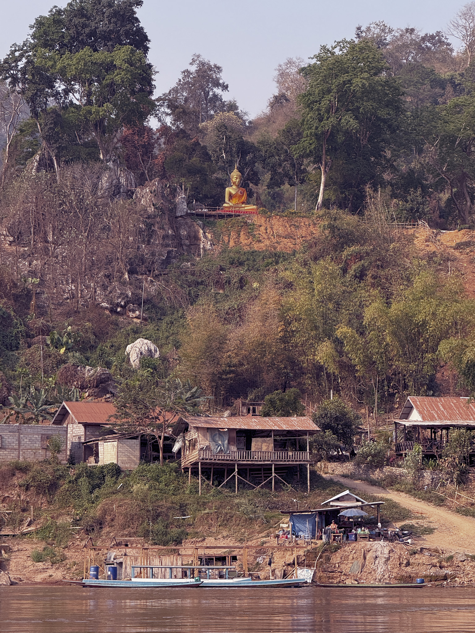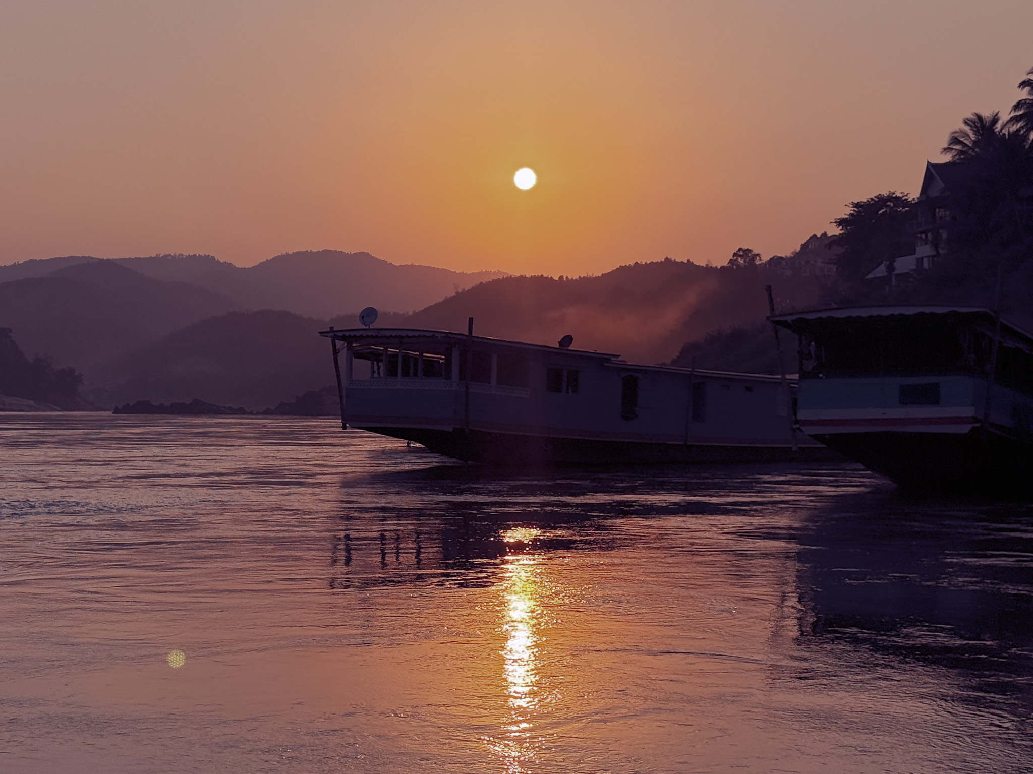 On the Thai hillside, a large golden Buddha presides over the river, part of the Golden Triangle region where Thailand, Laos, and Myanmar converge. As the sun dropped, it aligned almost perfectly over the Buddha’s shoulder and threw a long reflection straight down the center of the Mekong. The smoke from end-of-season crop burning hung in the air and turned the sky a deep reddish hue.