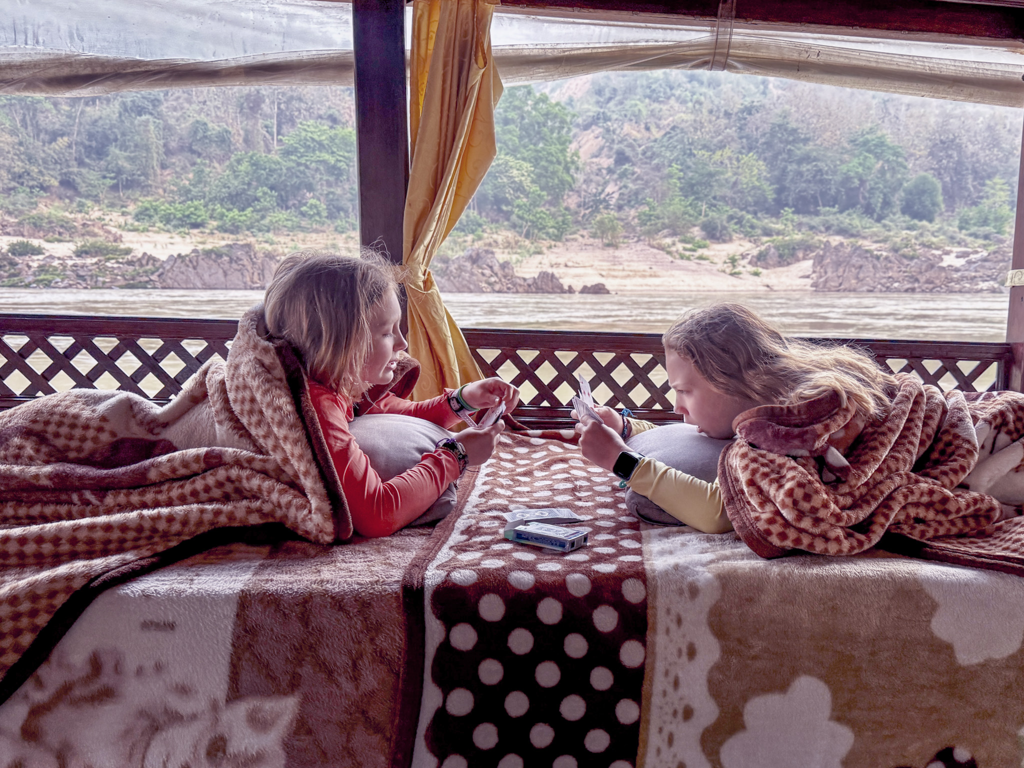 This boat ride holds significant sentimental value for Maxell and Shaina as well: on this boat ride in 2014 was when we first meet an American family “living abroad”, homeschooling their four kids while they saw the world and educated them in countless other ways. We told each other: “If we ever get married and have kids someday, we should do this.” Of course, the rest is history. This wasn’t the “water bus” version of a slow boat with rows of hard benches, which was how we remembered this same boat ride from nearly two decades ago. But here today, the boat we boarded was the comfortable kind—built for maybe 20 to 30 people—with cushioned seats, daybeds, and little booth setups. We found one that fit the four of us easily, with space to sprawl.