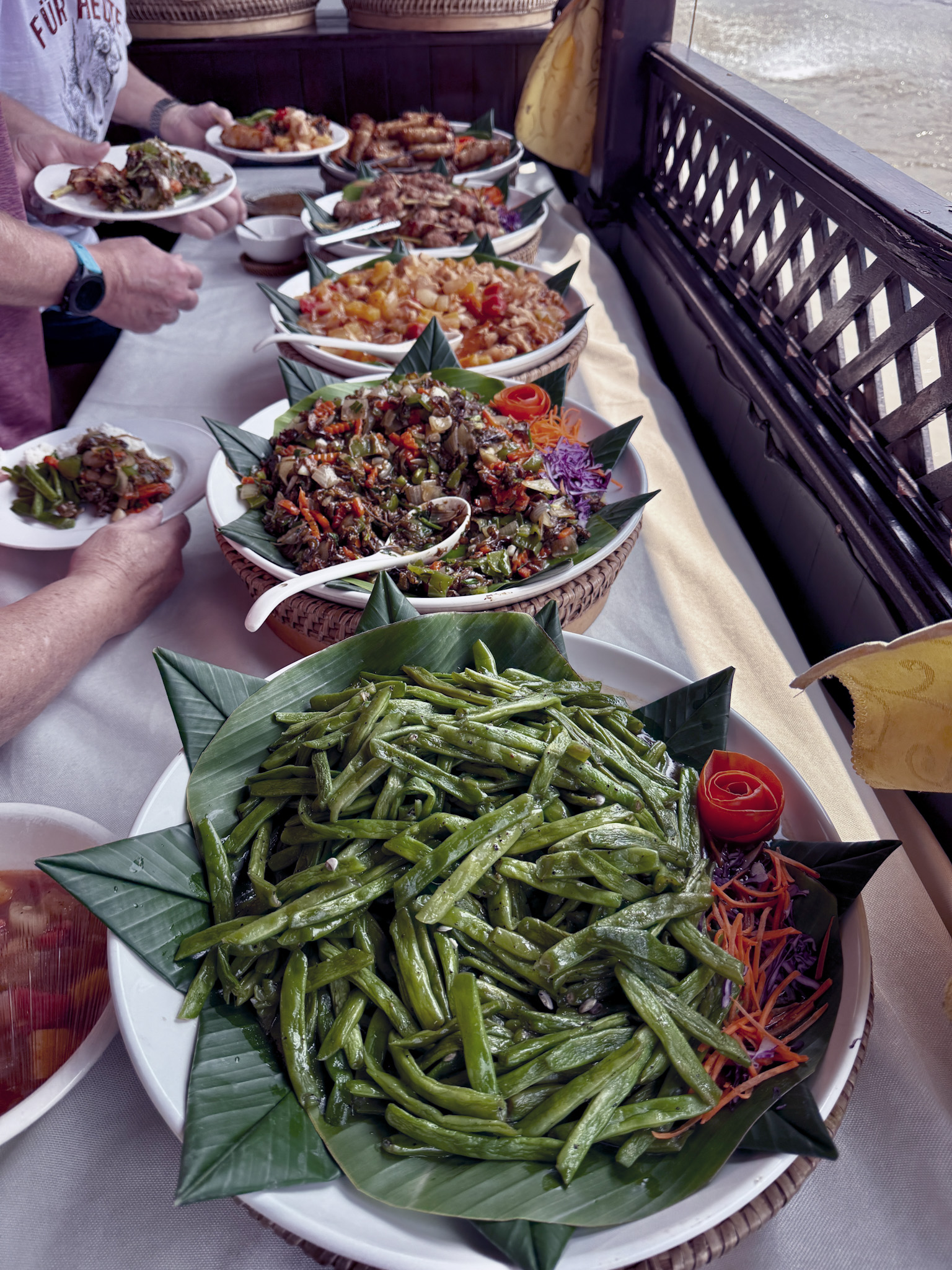 Lunch appeared mid-river both days and was one of those experiences where the context does as much work as the food itself. Spring rolls, sweet and sour chicken, pork and vegetables steamed in banana leaves, stir-fried vegetables, steamed rice, fresh fruit, hot tea—all of it elegantly arranged on banana leaves and bamboo trays, all of it produced by two women in a kitchen the size of a large closet, for twenty-four people, on a moving boat.