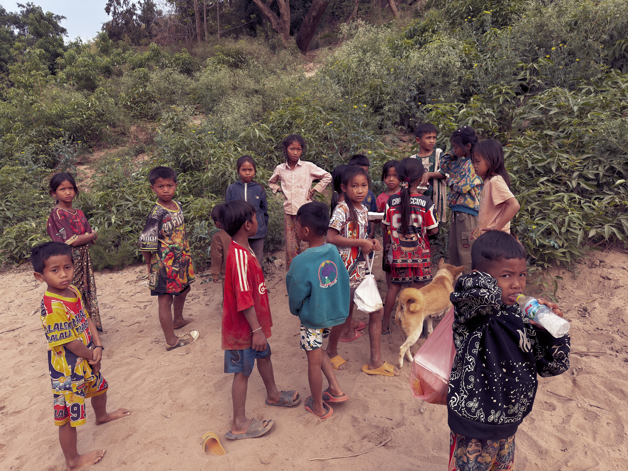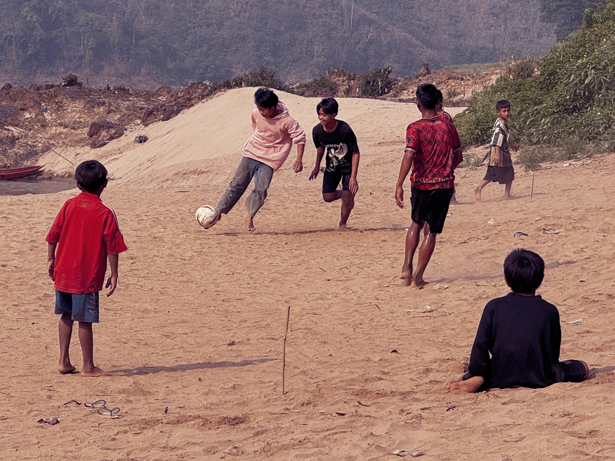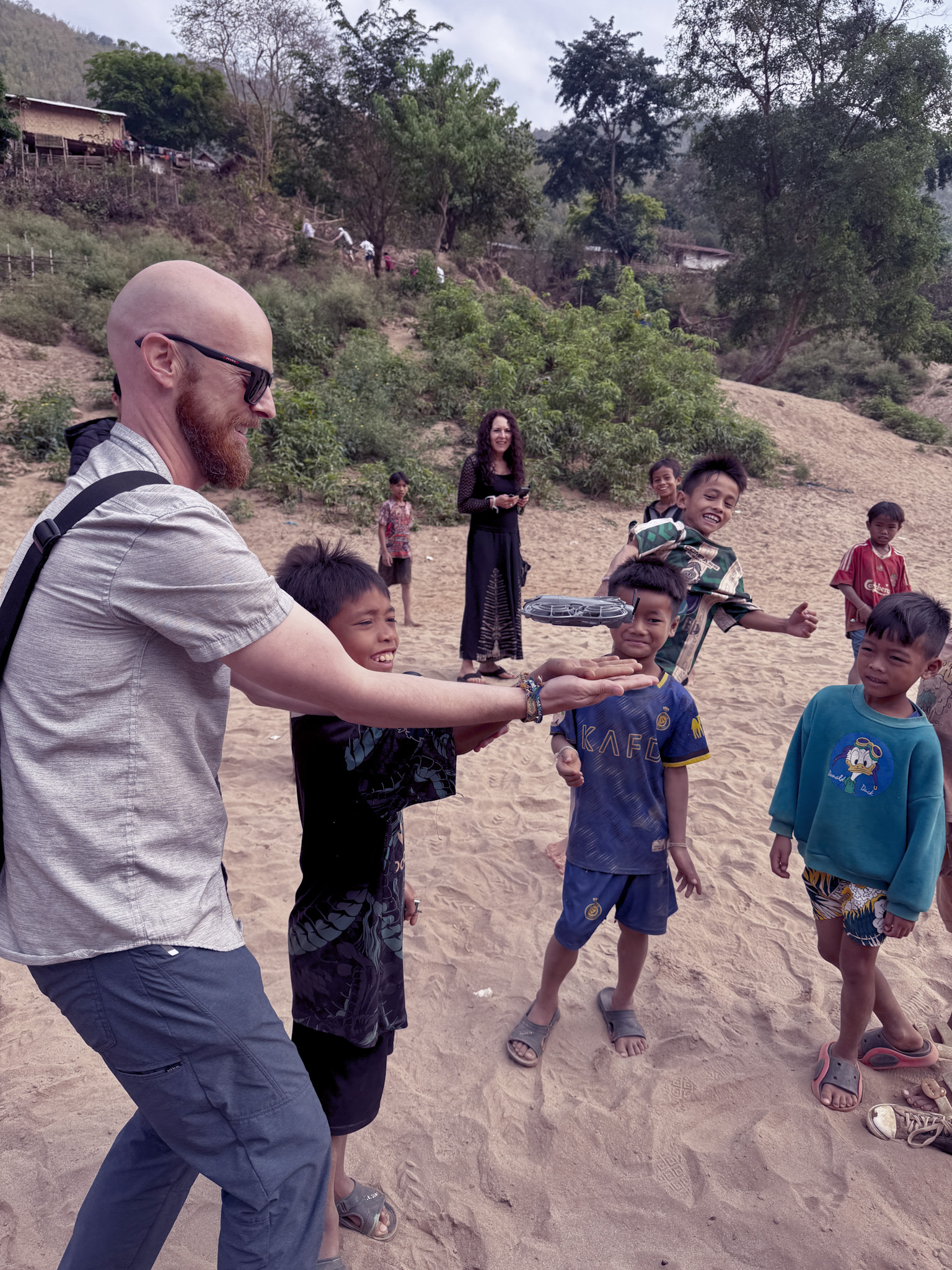 On the second day, the boat slowed and nosed toward a broad sandbank. About twenty children were waiting on the shore when we stepped off, ranging in age from maybe three to fifteen, most of them in the middle of a football match using two sticks pushed into the sand as goals. Max pulled out the drone and launched it off his hand, and the reaction was immediate and total—kids screaming, chasing it, laughing in that uninhibited way that requires no shared language whatsoever.