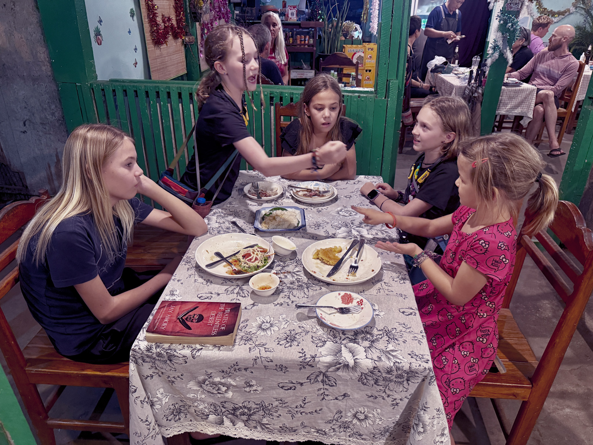That evening we had dinner with Hannah and her family, the American family we met in Luang Prabang, reunited as planned. Good food, easy conversation, and our girls disappeared with Jade, Luz, and Tomu the moment they arrived.
