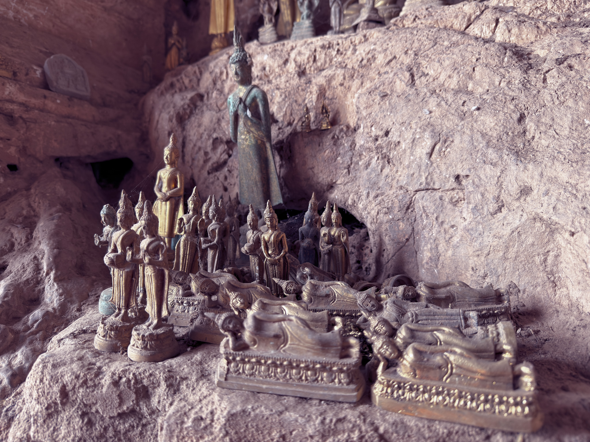 About ninety minutes into the first day, we pulled over for a stop at Pak Ou Caves, a sacred site carved into limestone cliffs where thousands of small Buddha statues have been placed over centuries by pilgrims.