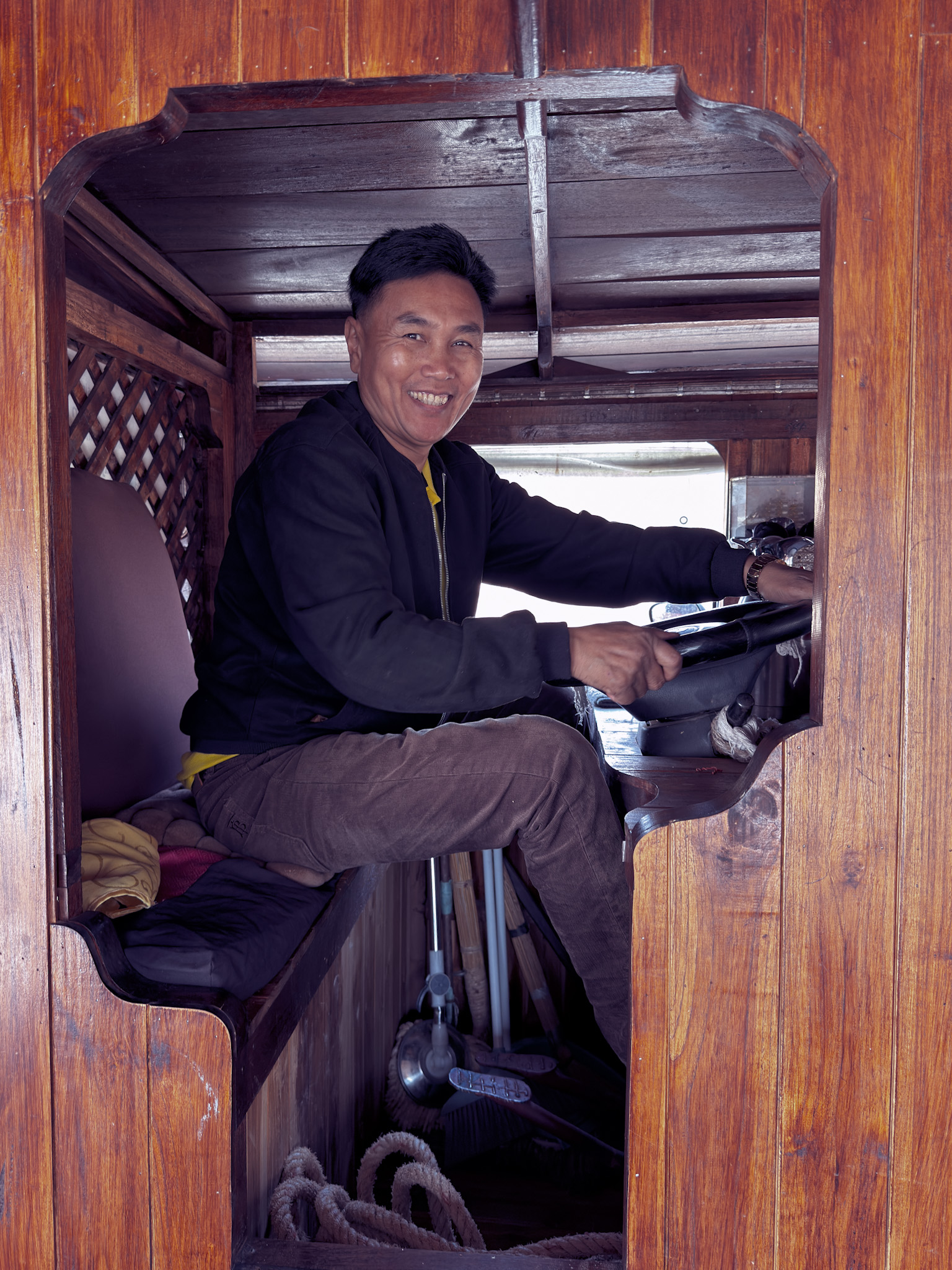 The captain, in particular, was something to watch. He sat at the helm for over ten hours each day, reading the river like a second language. This time of year the Mekong runs low, exposing sandbars and shifting channels that require real skill to navigate. From our completely unqualified perspective, he was flawless.