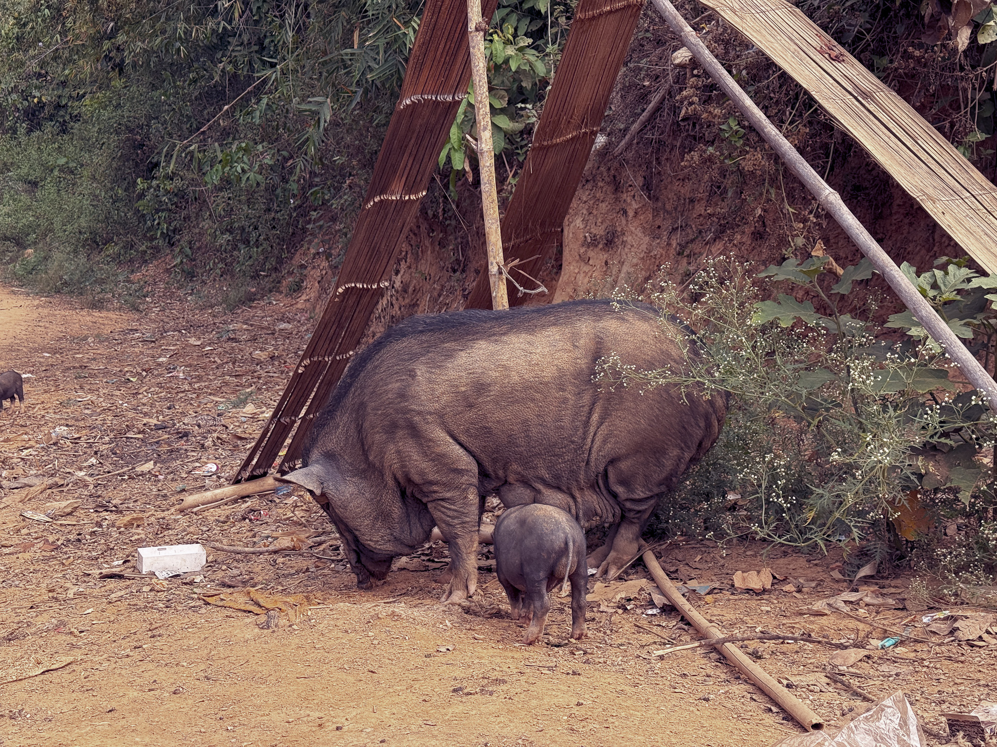 A few small solar panels and rudimentary battery systems were the only visible concessions to the modern electrical grid. Community spigots and shared toilets served the whole village. Pigs, chickens, goats, and dogs moved freely between the houses.