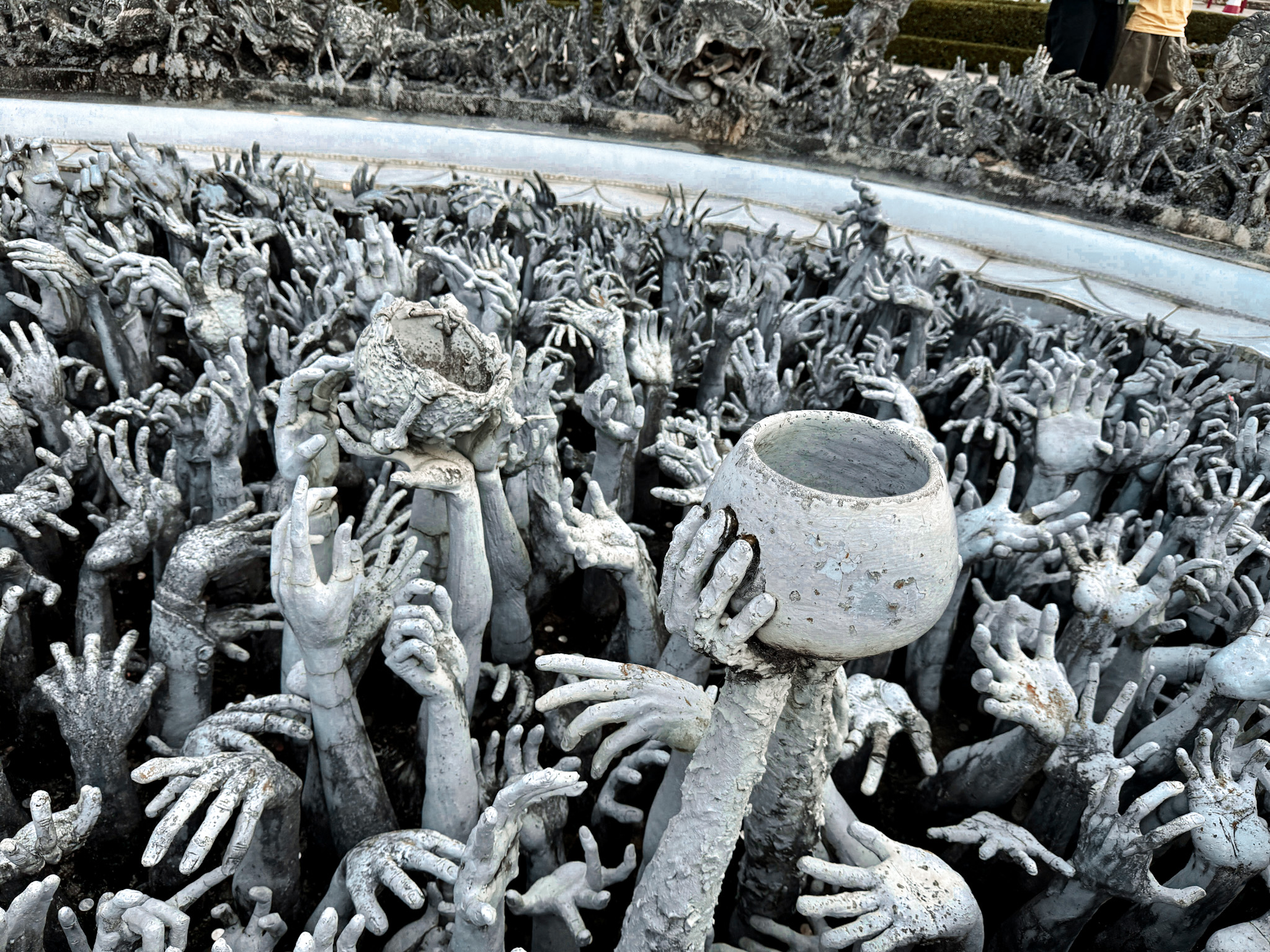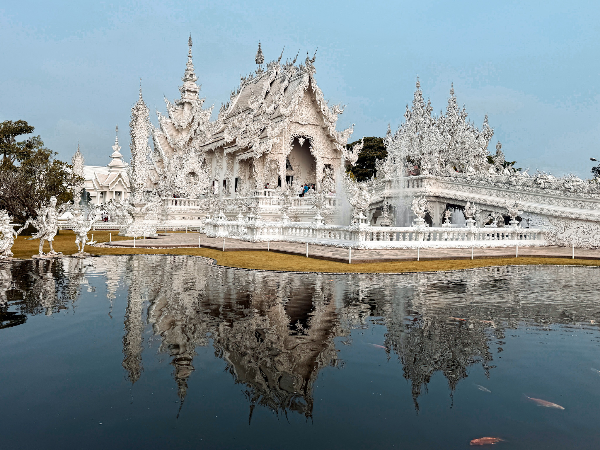 Wat Rong Khun is the life’s work of Chalermchai Kositpipat, a Chiang Rai-born national artist who has been designing, building, and funding the entire project out of his own pocket since 1997. The all-white exterior represents the purity of Buddha, while the mirrored glass embedded throughout symbolizes self-reflection. The bridge to the entrance crosses over a sea of arms reaching upward from the depths of hell, and the interior murals depict swirling flames, demon faces, and pop cultural figures—Michael Jackson, Neo from The Matrix, Freddy Krueger, Pokémon, a T-800 Terminator—alongside images of nuclear warfare and environmental destruction.