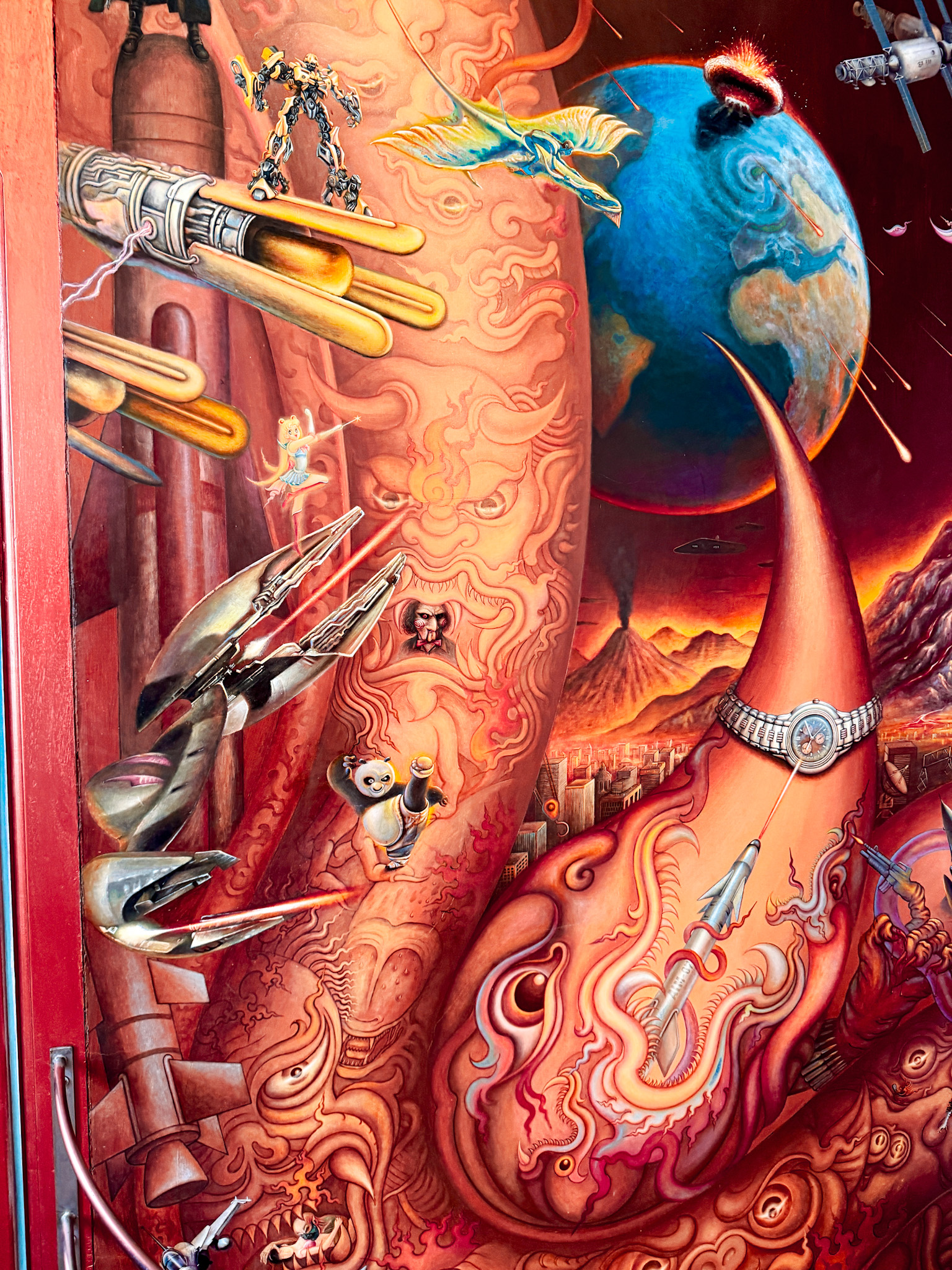 Standing inside it, the intention becomes clearer: the pop culture figures aren’t being revered, they’re being used as a warning. The things that distract us from what actually matters—patience, education, family, community—rendered in the visual language most likely to get our attention.