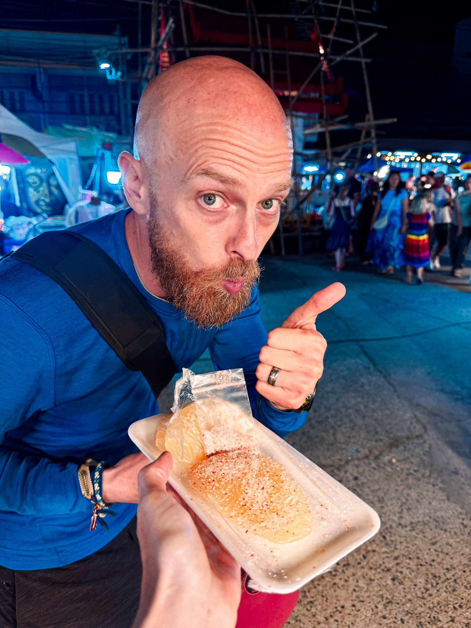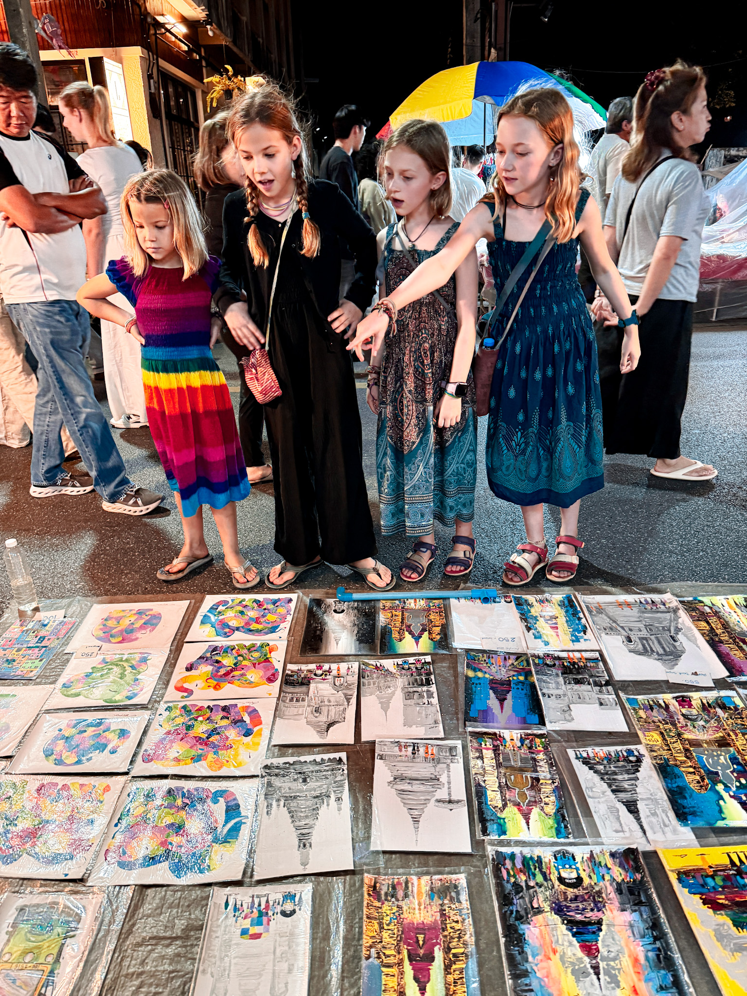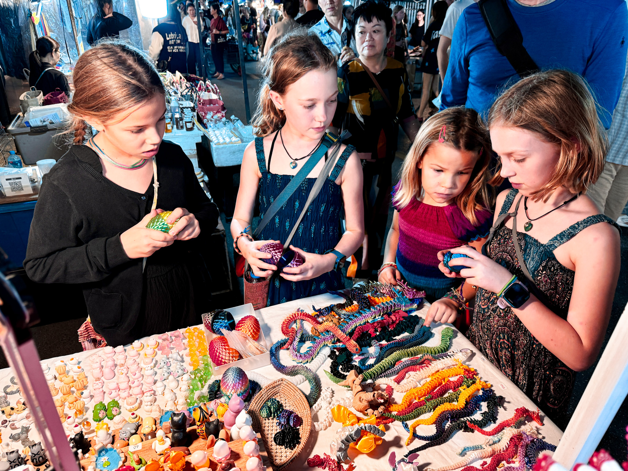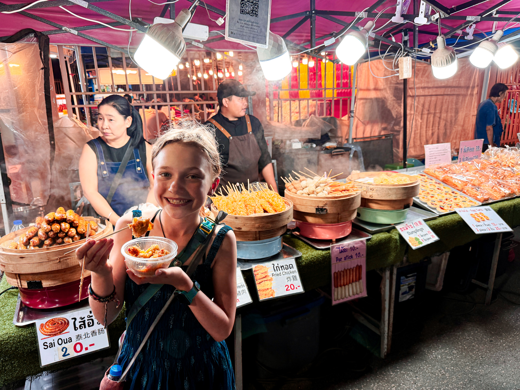When Hannah and Candace got back, we all headed to the epic Chiang Mai Saturday night market together. It skews more heavily toward food than souvenirs—closer in spirit to a hawker market than a craft market—and the crowd was thick in the pleasant way. We worked our way through chicken satay, pomelo, corn on the cob, sausage, dumplings, ice cream, and several other things we’ve already forgotten. The four girls took off enthusiastically, exploring as a herd and only occasionally reappearing when they needed money to buy food. We practiced our new-found parental patience: often not knowing where your children are in a slow-moving sea of hundreds of people.