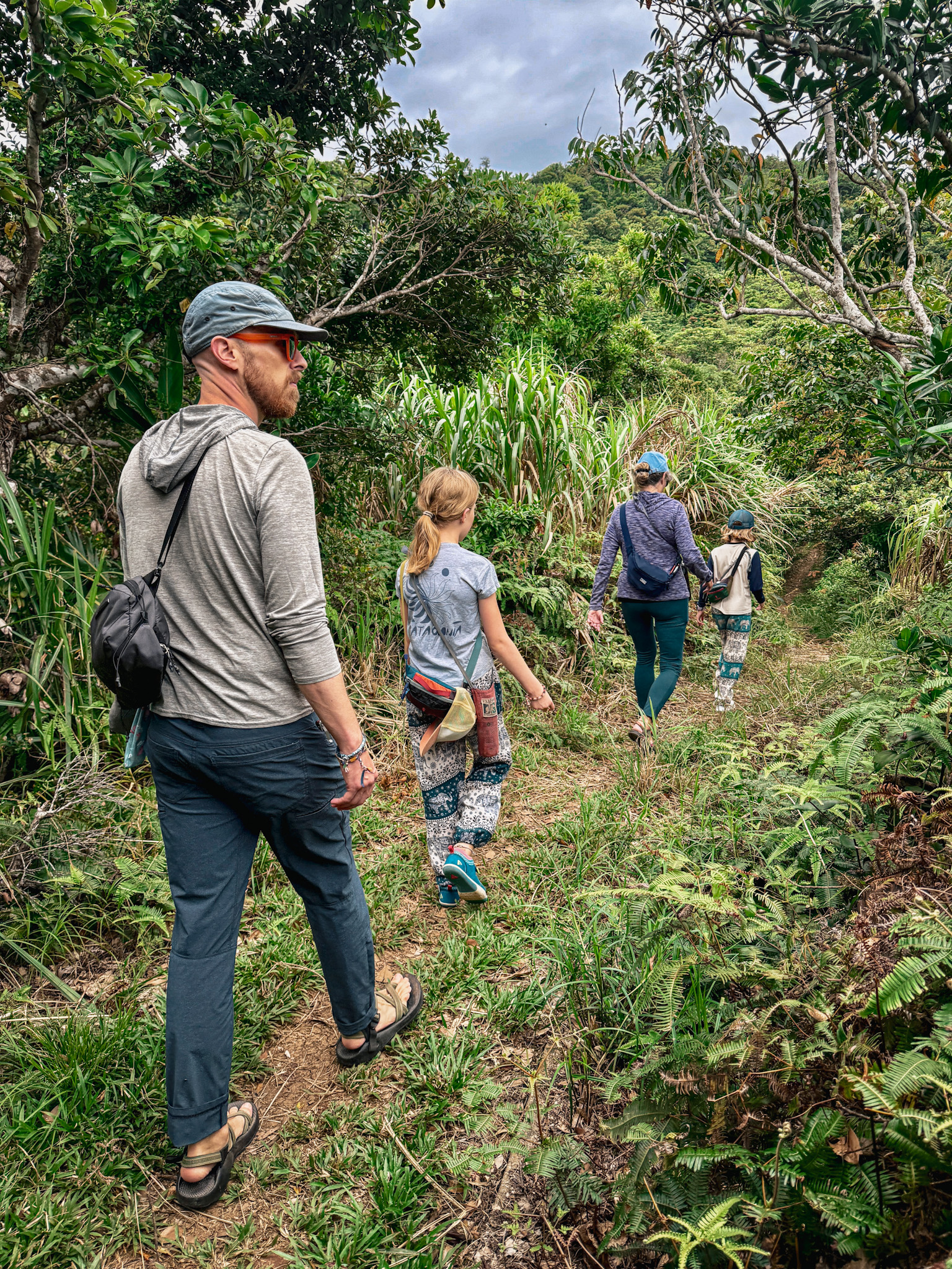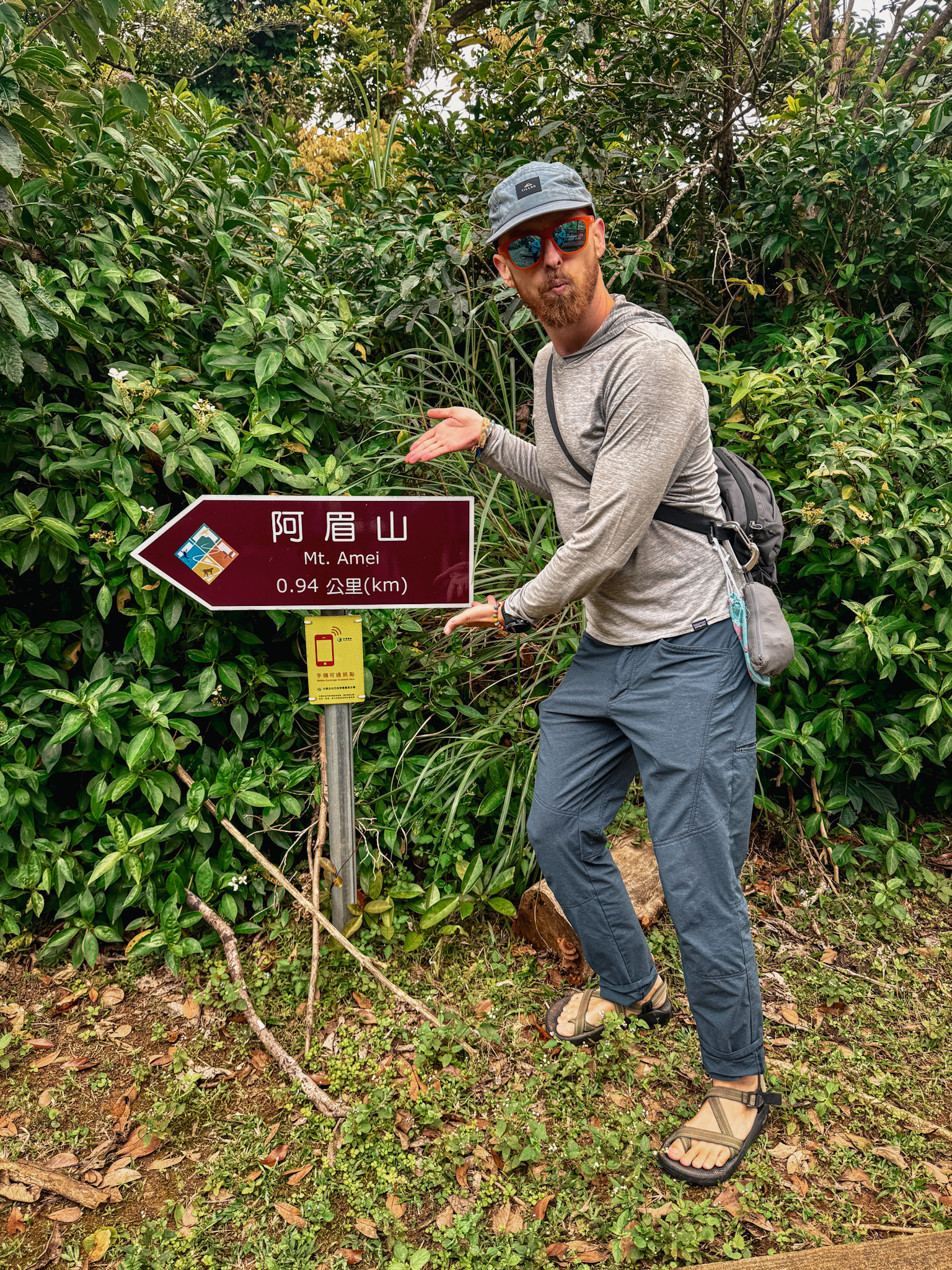 One day we rode the scooters to the trailhead for Ameishan, the highest point on the island. Short hike, moderate grade, subtropical forest the whole way up — ferns and grasses at ground level, pandanus at mid-height, a bintaro canopy keeping most of the sun off. About halfway up the trail we came across two women standing very still, staring up into the canopy with expressions of focused attention.