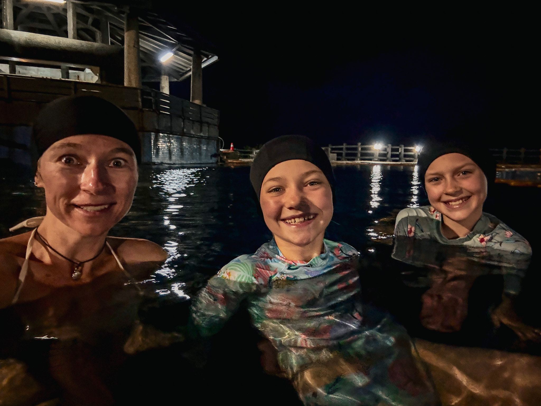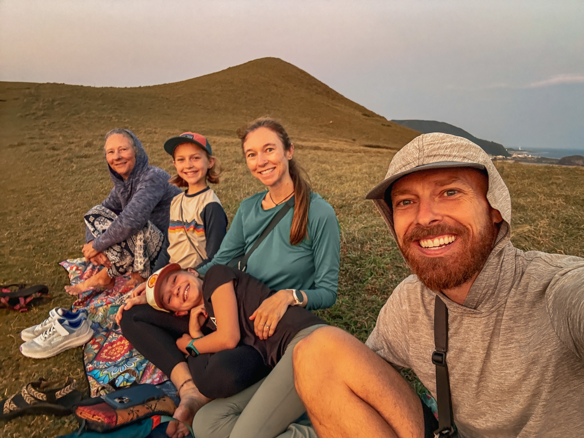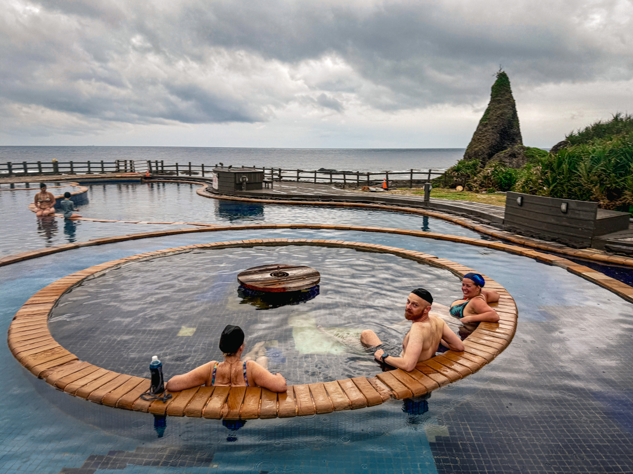 The sunrise, for its part, was a complete no-show. Solid cloud cover from horizon to horizon. Not a sliver of dramatic sky. This is exactly the kind of thing that would have been deflating if the point of getting up at 4:30 had actually been the sunrise. It turned out the point was sitting in a hot saltwater spring on a small volcanic island with the Pacific in front of us and new friends we’d met two days ago beside us, in the dark, in the rain, at five in the morning, bouncing between pools of varying temperatures while the sky quietly brightened into grey. It didn’t require a dramatic sky. It didn’t need to.