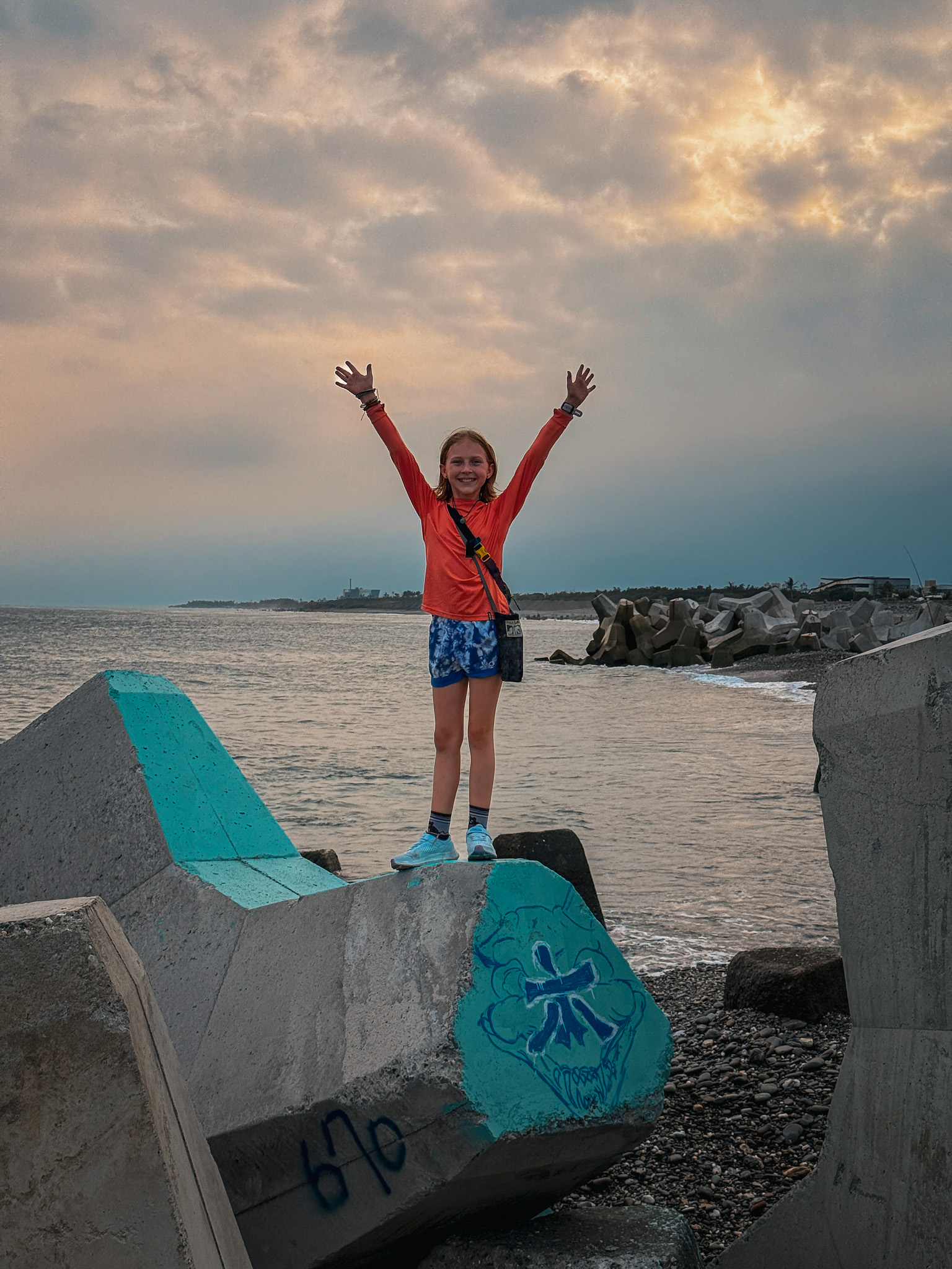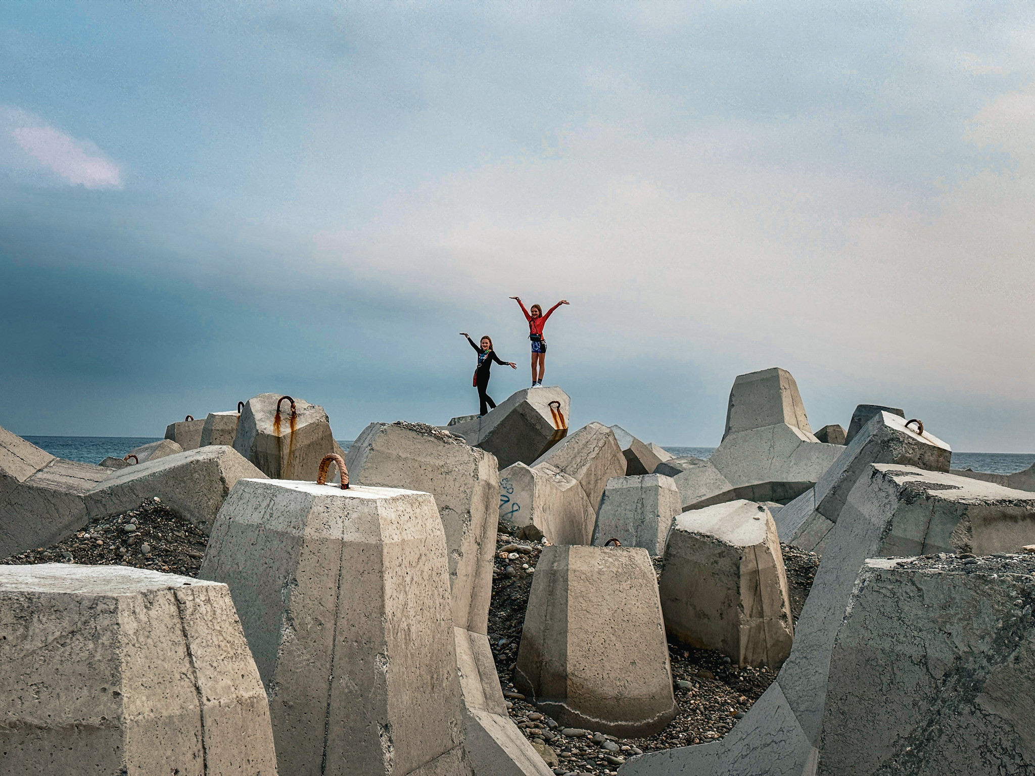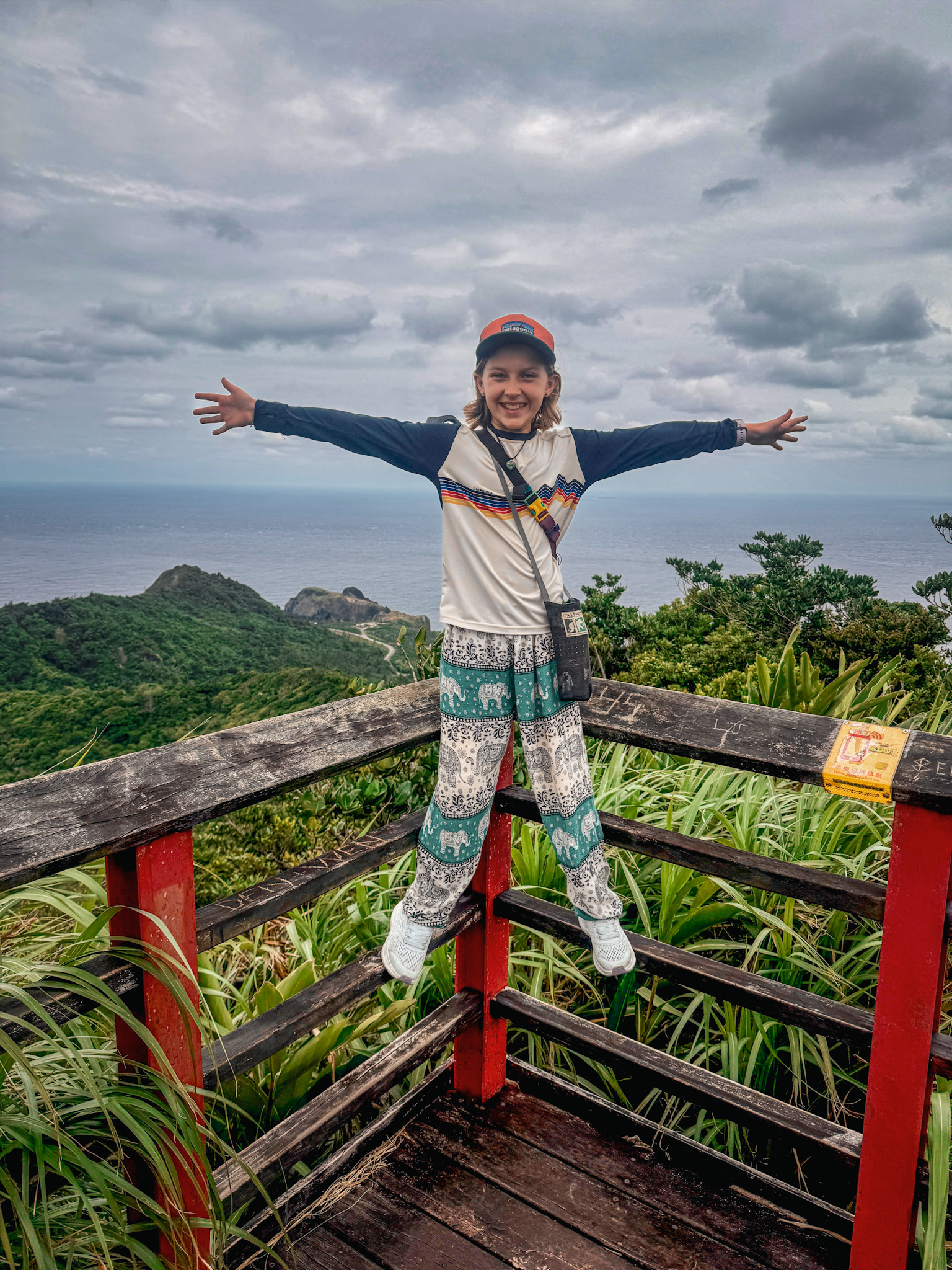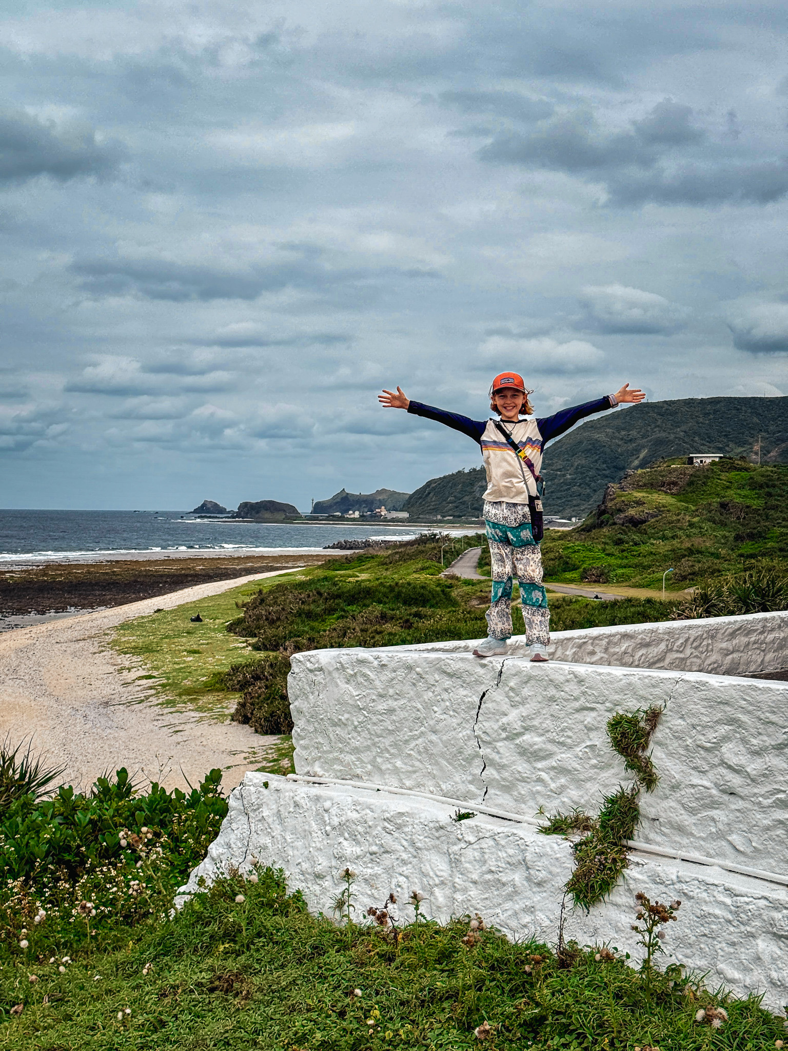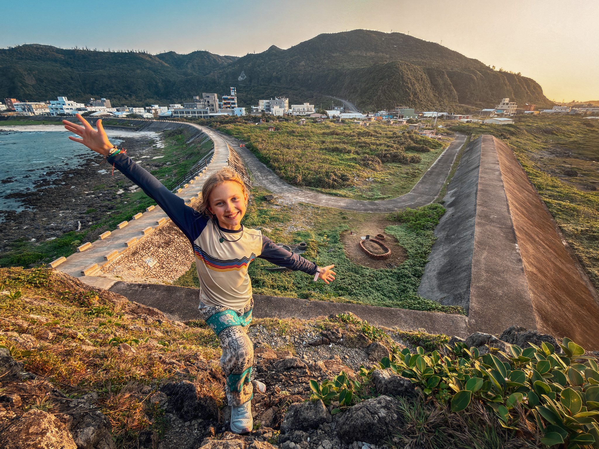 We explored in the way you do when a place is small enough to know and interesting enough to keep looking: Snoopy Rock, where a coastal formation does bear a passing resemblance to the famous beagle if you approach from the right angle and apply some goodwill, though the girls were too busy running wild up the bluff paths to spend much time confirming the resemblance. The Little Great Wall, a short ridge path named with considerably more ambition than the path itself warrants, but with a genuinely spectacular view down over Haishenping Bay — the remains of a volcanic crater, a crescent of turquoise water ringed by dark cliffs, with the Pekingese Dog Rock and the Sleeping Beauty formation visible below if you look long enough to let your eyes find them.
