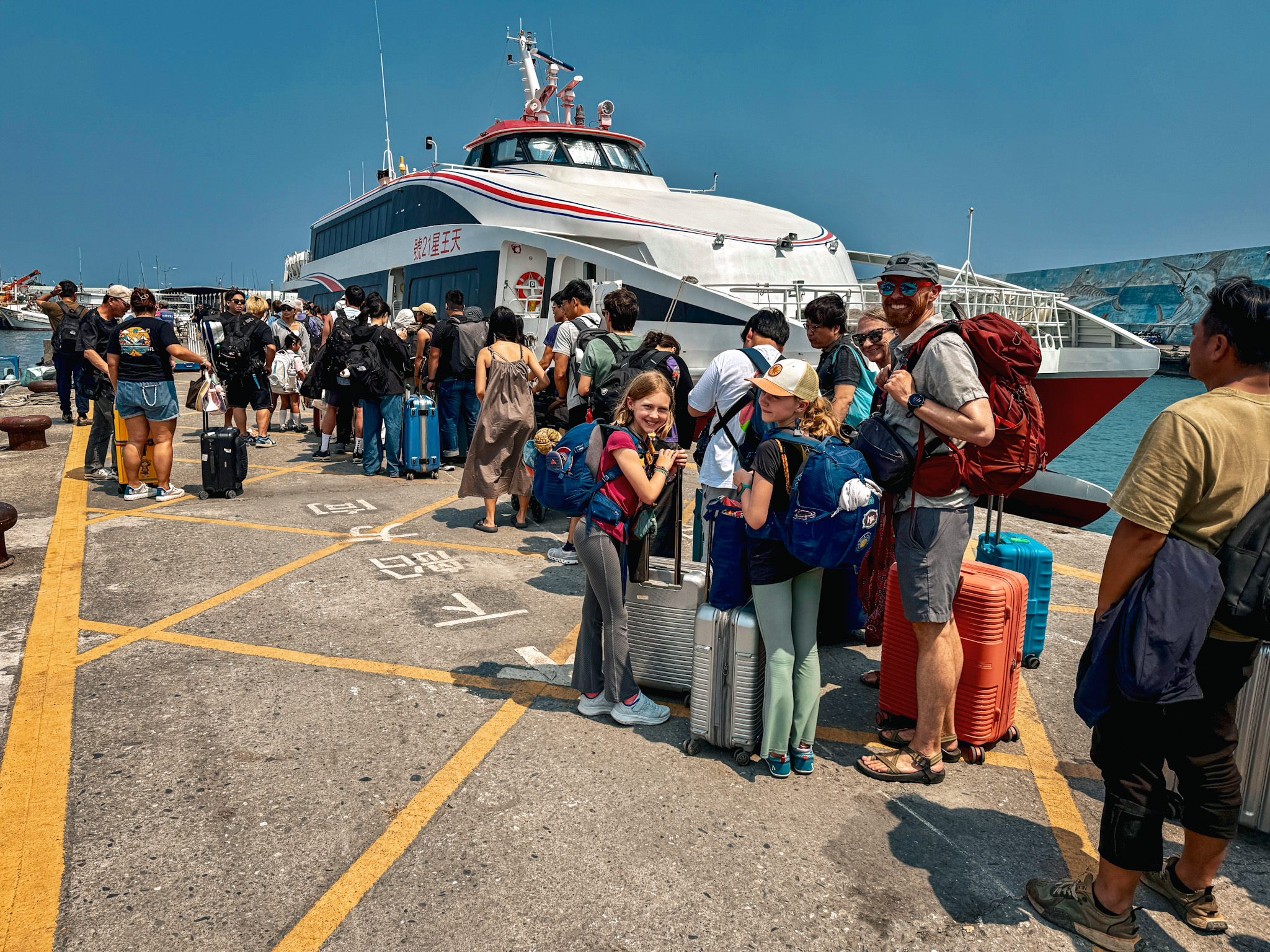 He took the advice this time. It helped. Barely. But just enough. The boat pulled into Green Island’s marina and both Finlee and Max walked off the gangway on their own two legs, which we all counted as a win. If the crossing had been five minutes longer, they both would have a plastic bag souvenir and no more miso pork pancake. Max looked over at Shaina on the pier. She had finished a chapter and moved on to the next.